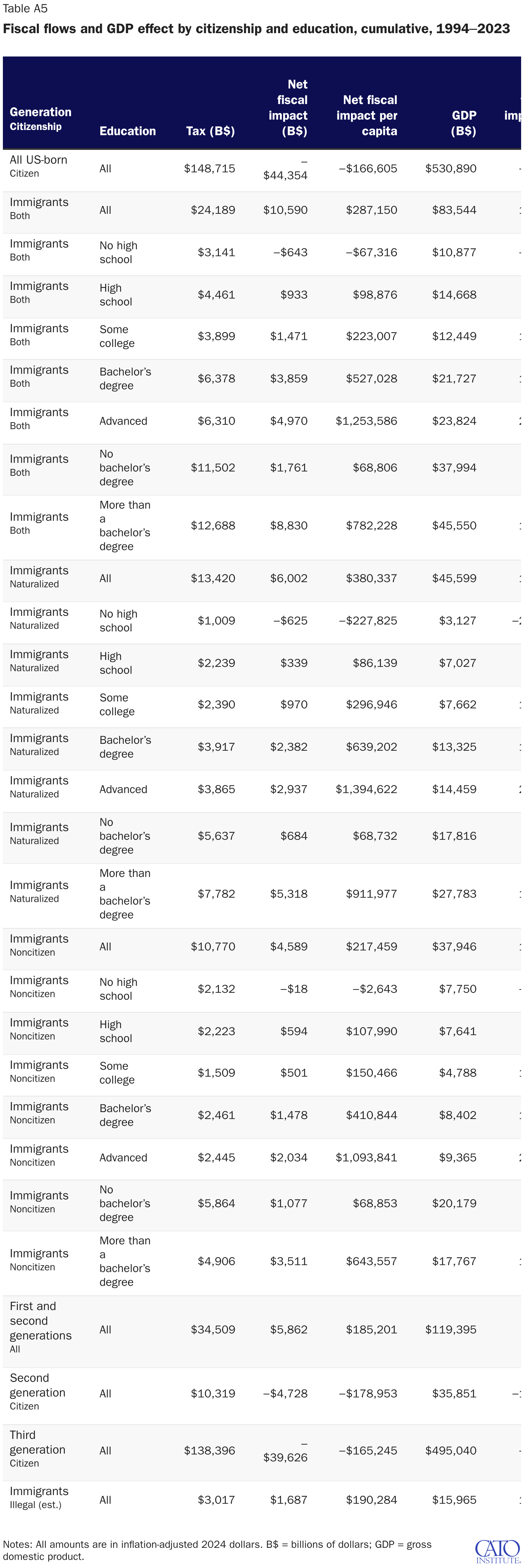 Fiscal flows and GDP effect by citizenship and education, cumulative, 1994