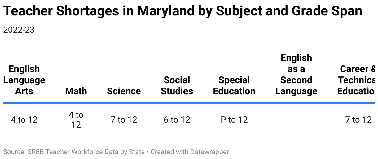 Teacher Shortages in Maryland by Subject and Grade Span