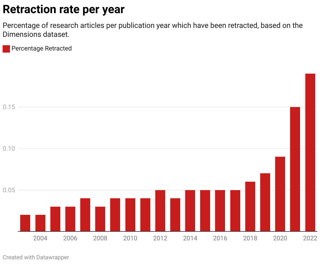 Percentage of research articles per publication year which have been retracted, based on the Dimensions dataset.