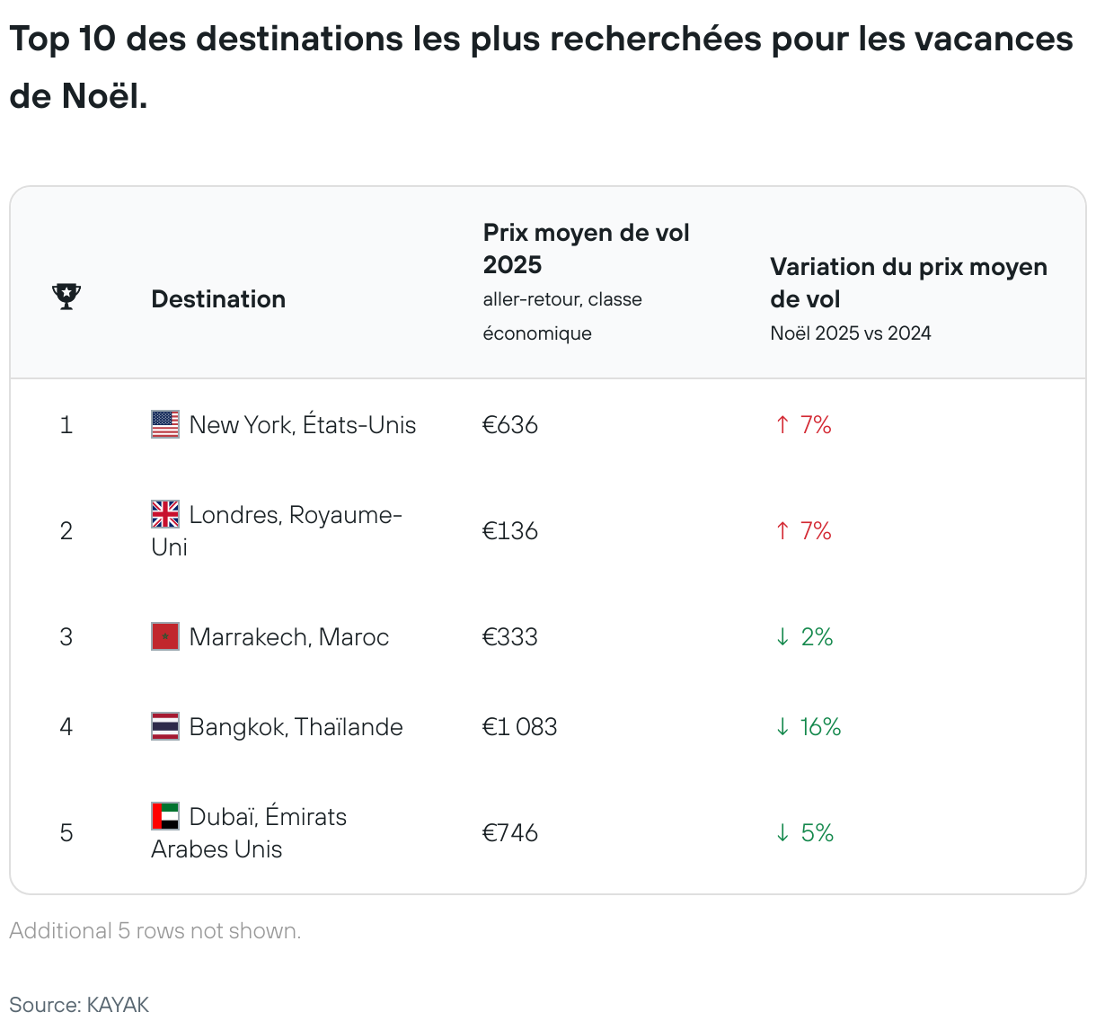 Top 10 des destinations les plus recherchées pour les vacances de Noël.