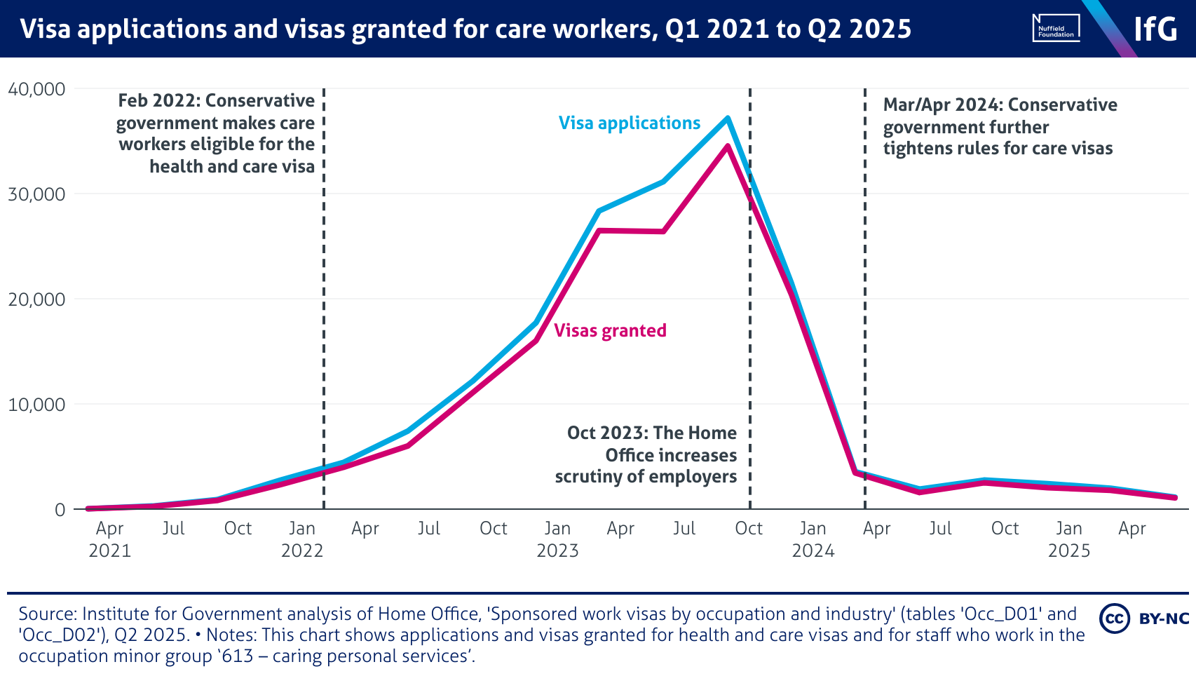 Visa applications and visas granted for care workers, Q1 2021 to Q2 2025
