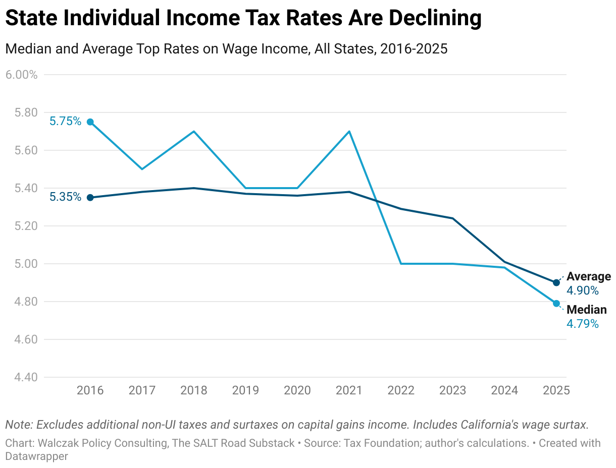Median and Average Top Rates on Wage Income, All States, 2016-2025