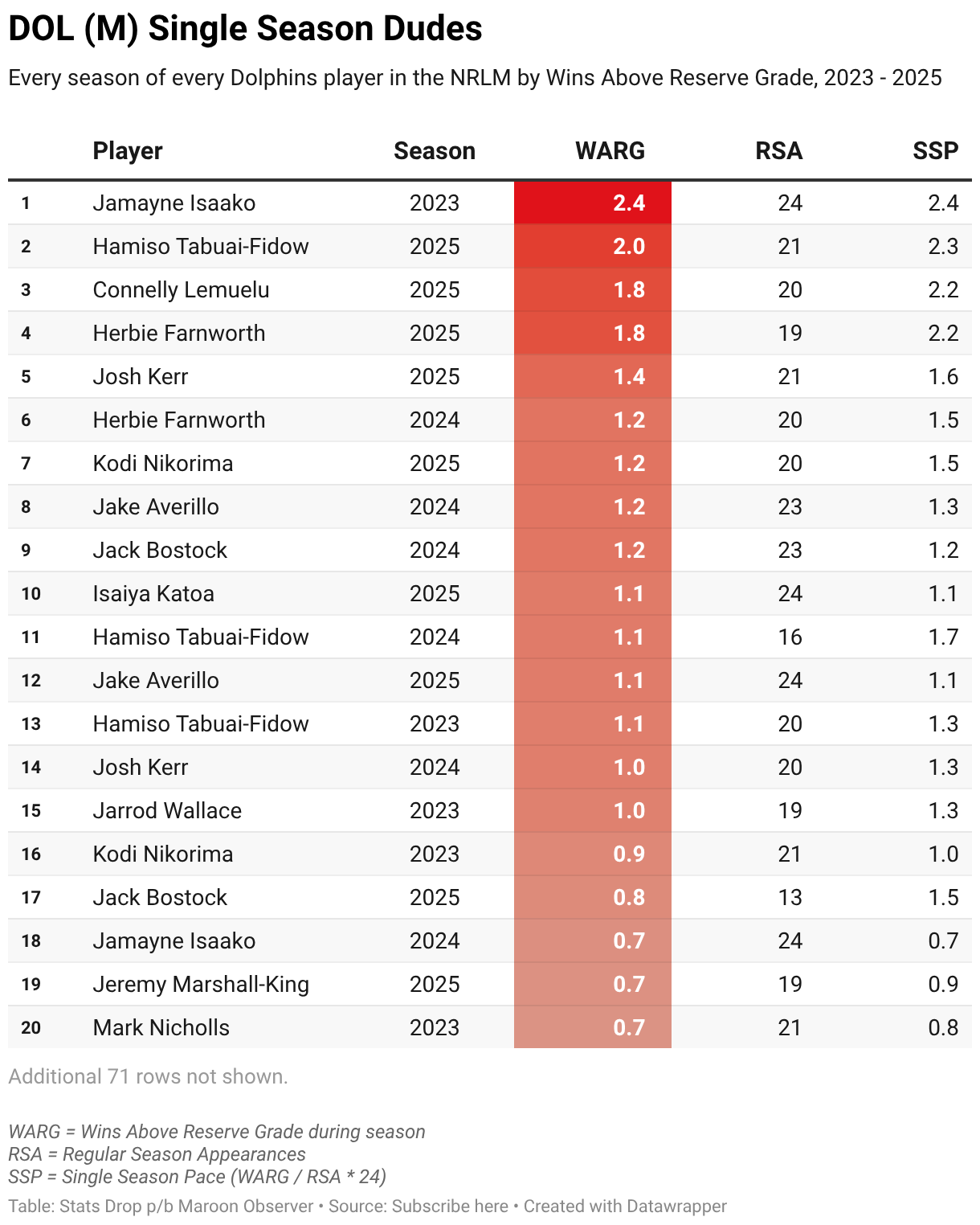 Every season of every Dolphins player in the NRLM by Wins Above Reserve Grade, 2023 - 2025