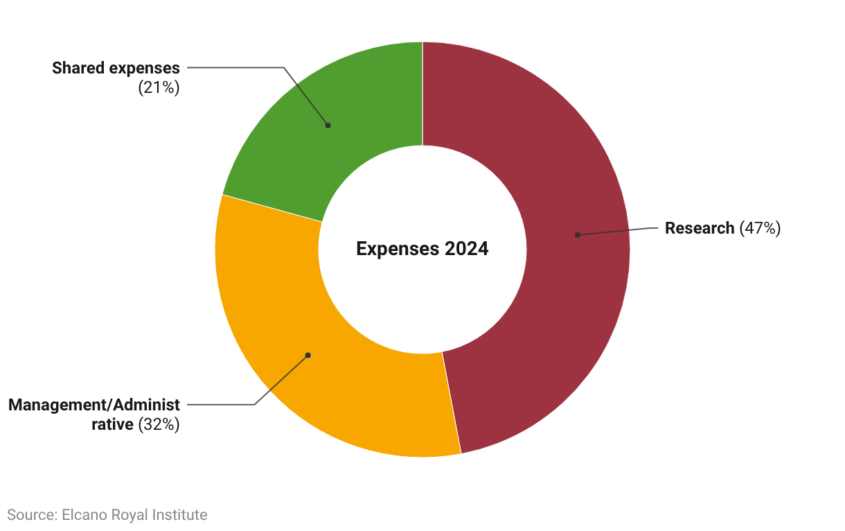 A pie chart showing the percentage breakdown of the Elcano Royal Institute’s expenses in 2024 by type: Research 47% (red), Management/Administrative 32% (yellow) and shared expenses 21% (green).