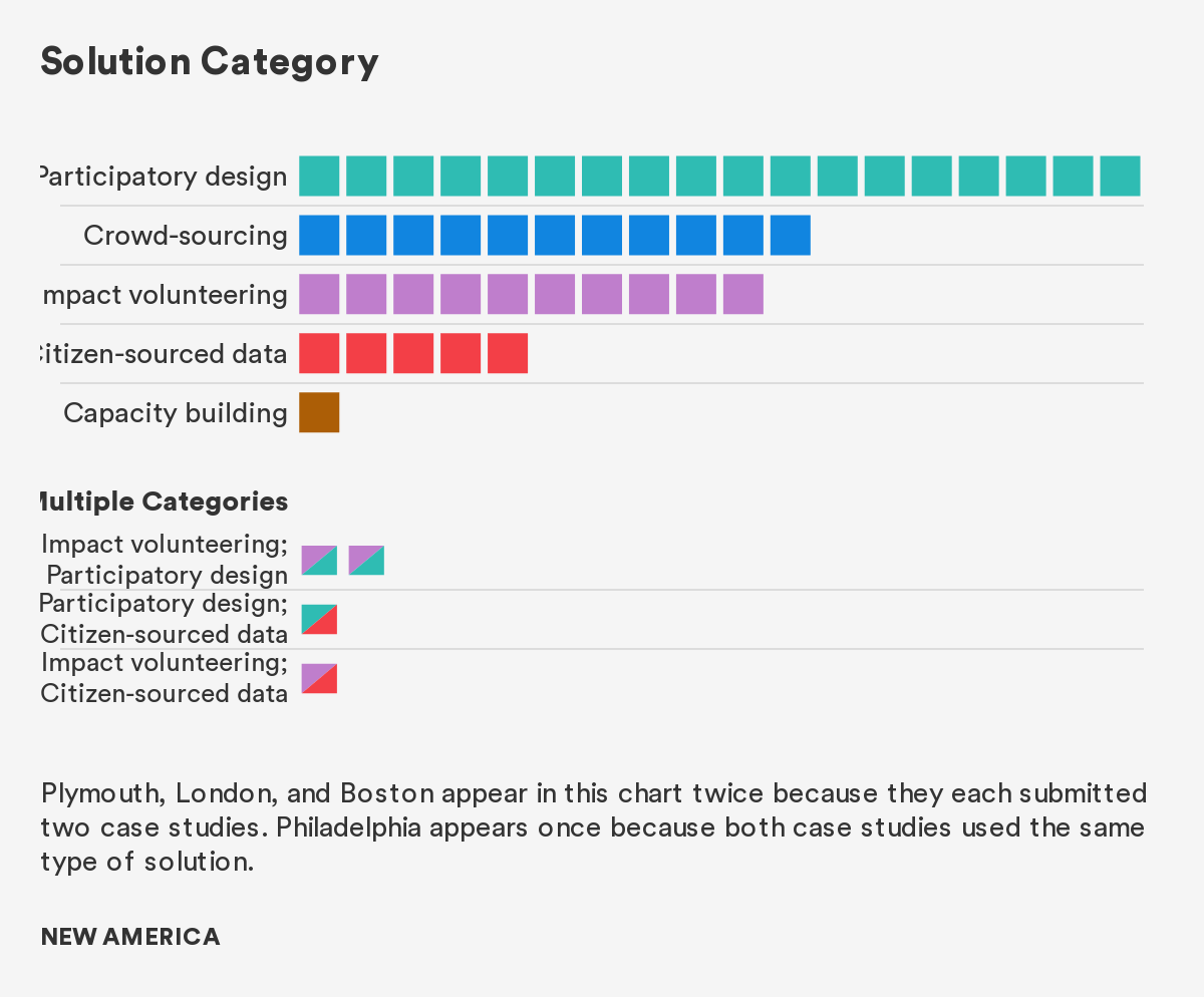 Plymouth, London, and Boston appear in this chart twice because they each submitted two case studies. Philadelphia appears once because both case studies used the same type of solution.