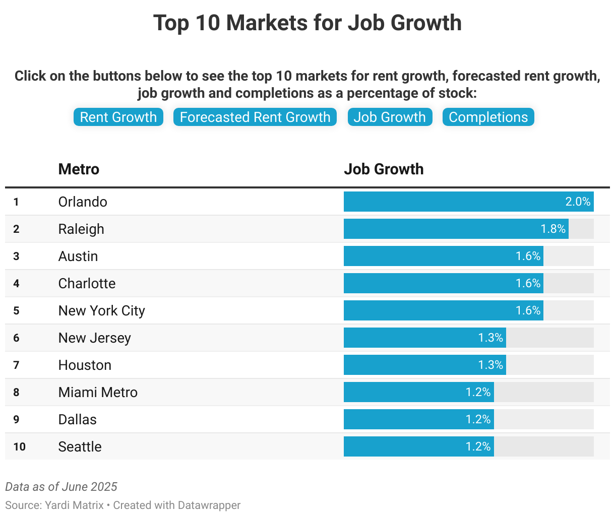 Click on the buttons below to see the top 10 markets for rent growth, forecasted rent growth, job growth and completions as a percentage of stock: