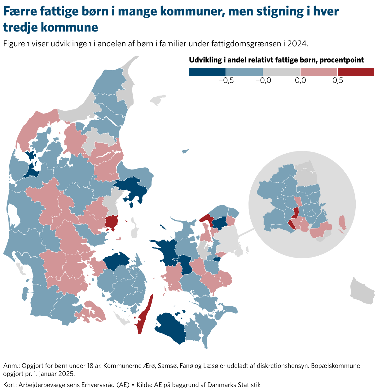 Figuren viser udviklingen i andelen af børn i familier under fattigdomsgrænsen i 2024.