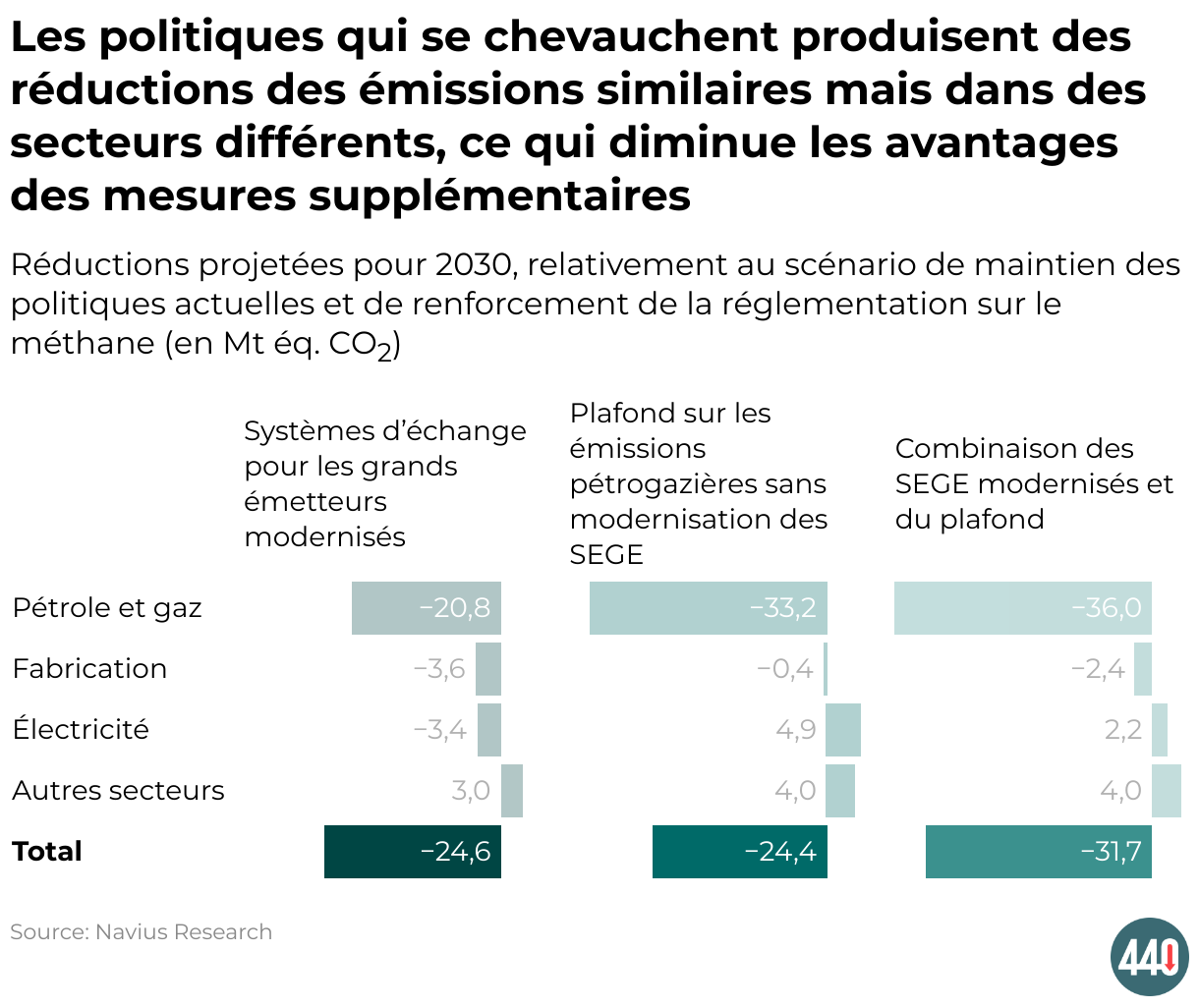 Les systèmes d'échange pour les grands émetteurs modernisés permettent de réduire les émissions de 24,6 mégatonnes supplémentaires par rapport à un scénario de référence prévoyant des politiques actuelles et des réglementations renforcées sur le méthane. La plupart des réductions se situent dans le secteur du pétrole et du gaz, avec une part plus faible dans les secteurs de fabrication et de l'électricité, tandis que les émissions augmentent légèrement dans d'autres secteurs. En revanche, un plafond sur les émissions du secteur pétrogazière entraîne des réductions totales de 24,4 Mt, toutes les réductions par rapport au scénario de référence ayant lieu dans le secteur pétrogazière, tandis que les émissions augmentent dans tous les autres secteurs. La combinaison de systèmes d'échange pour les grands émetteurs et d'un plafond d'émissions conduit à des réductions similaires à celles du scénario du plafond d'émissions, à l'exception de quelques réductions supplémentaires dans le secteur de fabrication.