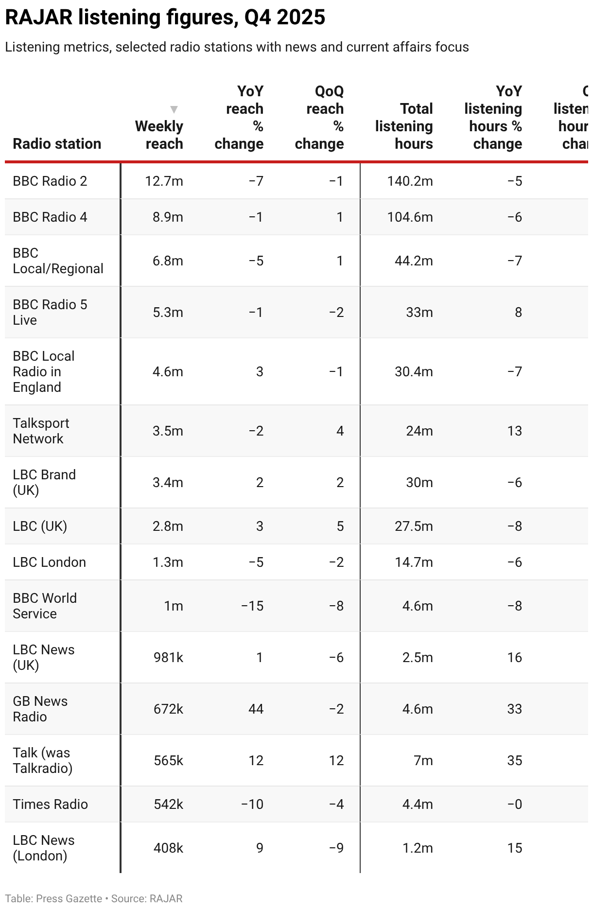 Listening metrics, selected radio stations with news and current affairs focus