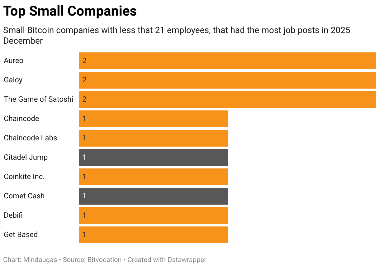 Small Bitcoin companies with less that 21 employees, that had the most job posts in 2025 December