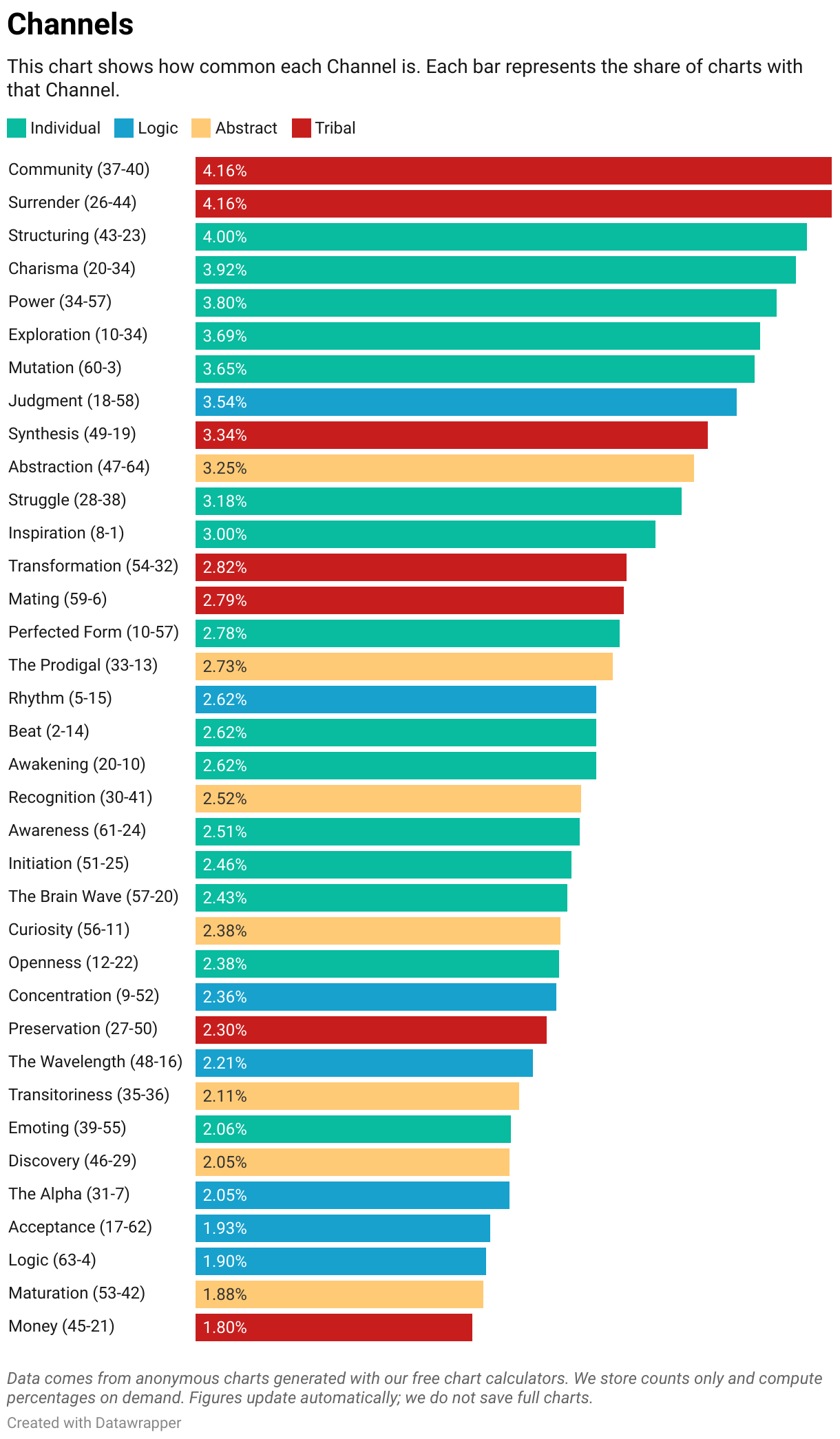 This chart shows how common each Channel is. Each bar represents the share of charts with that Channel.