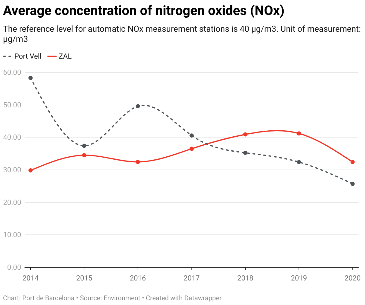 The reference level for automatic NOx measurement stations is 40 µg/m3. Unit of measurement: µg/m3