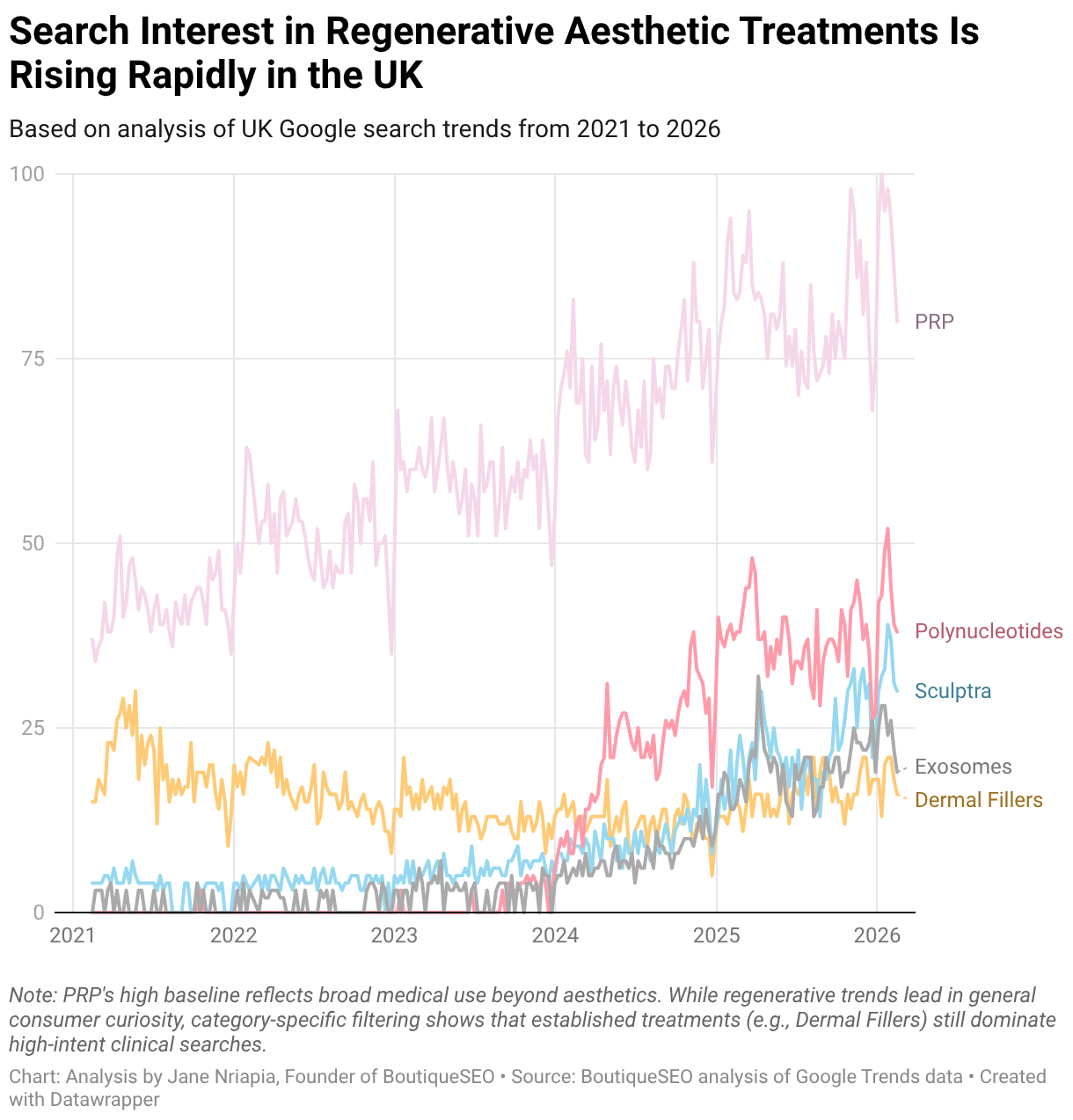 Line chart showing UK search interest trends from 2021 to 2026 for polynucleotides, dermal fillers, exosomes, PRP, and Sculptra. Regenerative treatments show strong growth while dermal fillers remain relatively stable.