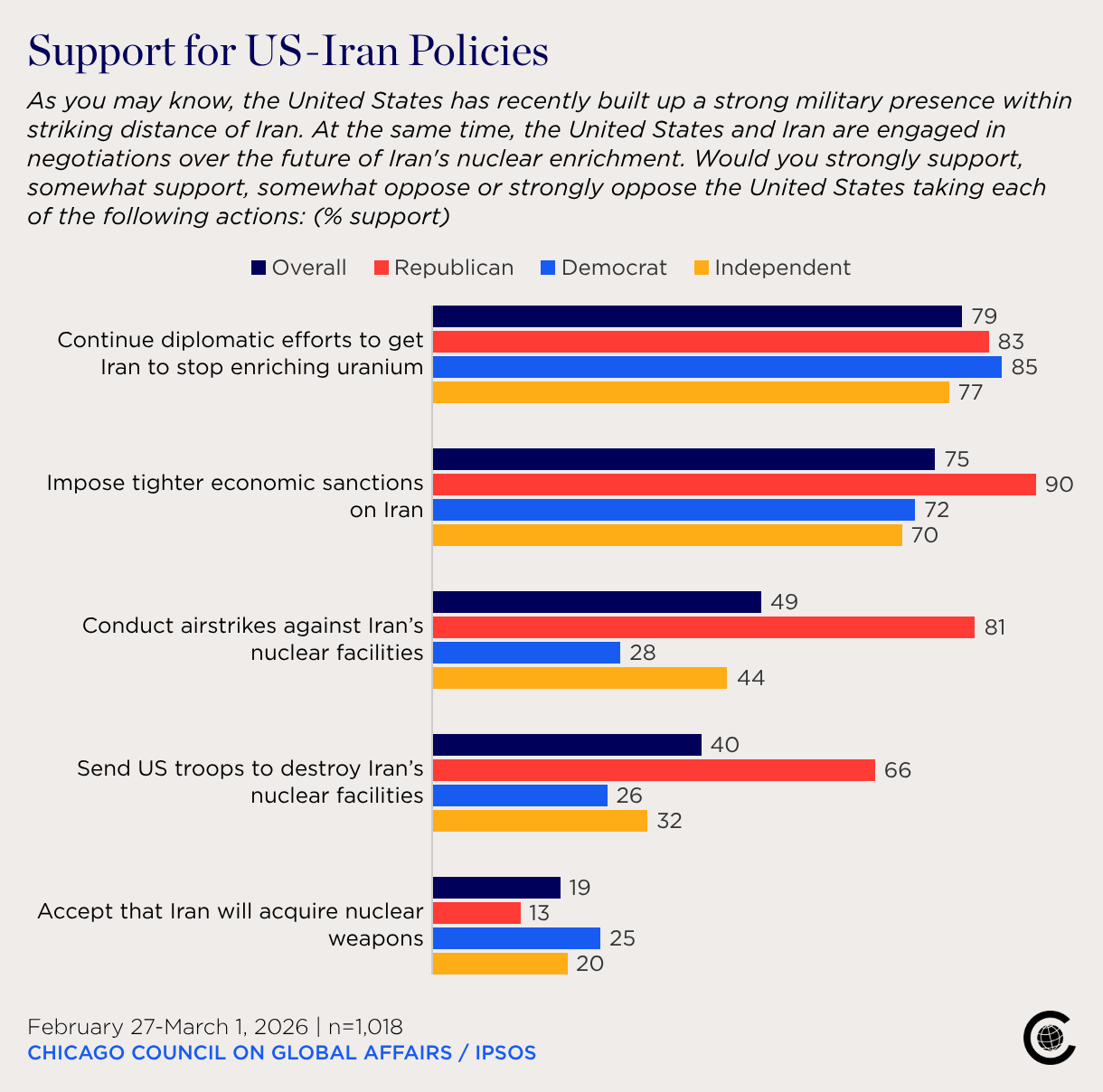 As you may know, the United States has recently built up a strong military presence within striking distance of Iran. At the same time, the United States and Iran are engaged in negotiations over the future of Iran's nuclear enrichment. Would you strongly support, somewhat support, somewhat oppose or strongly oppose the United States taking each of the following actions: (% support)