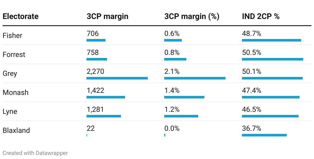 In seats where the independent came close to making the 2CP count but missed out, how close did they come and what 2CP would they have be expected to achieve if they had made that count?