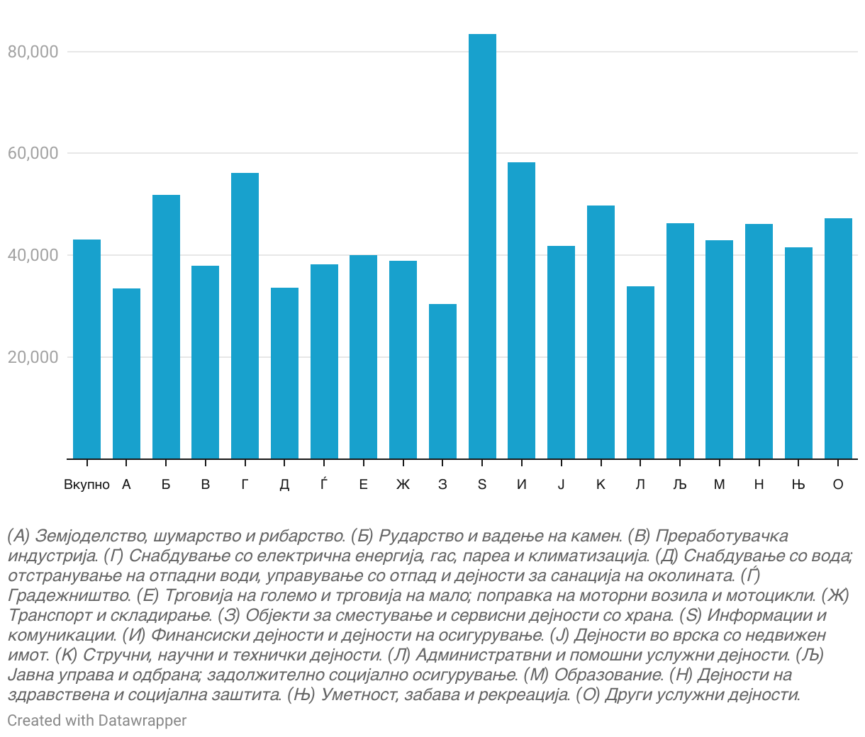(А) Земјоделство, шумарство и рибарство. (Б) Рударство и вадење на камен. (В) Преработувачка индустрија. (Г) Снабдување со електрична енергија, гас, пареа и климатизација. (Д) Снабдување со вода; отстранување на отпадни води, управување со отпад и дејности за санација на околината. (Ѓ) Градежништво. (Е) Трговија на големо и трговија на мало; поправка на моторни возила и мотоцикли. (Ж) Транспорт и складирање. (З) Објекти за сместување и сервисни дејности со храна. (Ѕ) Информации и комуникации. (И) Финансиски дејности и дејности на осигурување. (Ј) Дејности во врска со недвижен имот. (К) Стручни, научни и технички дејности. (Л) Администратвни и помошни услужни дејности. (Љ) Јавна управа и одбрана; задолжително социјално осигурување. (М) Образование. (Н) Дејности на здравствена и социјална заштита. (Њ) Уметност, забава и рекреација. (О) Други услужни дејности.