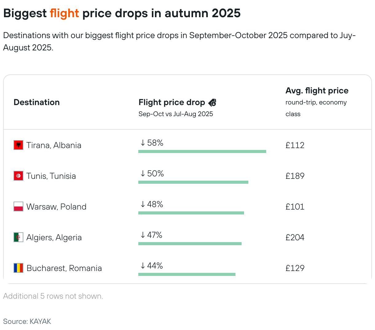 Destinations with our biggest flight price drops in September-October 2025 compared to Juy-August 2025.