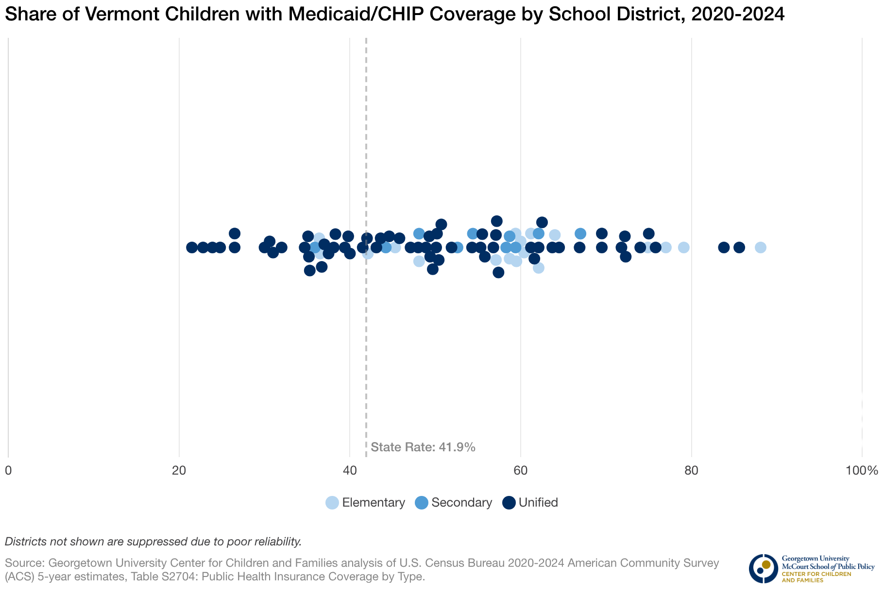 Share of Vermont Children with Medicaid/CHIP Coverage by School District, 2020-2024