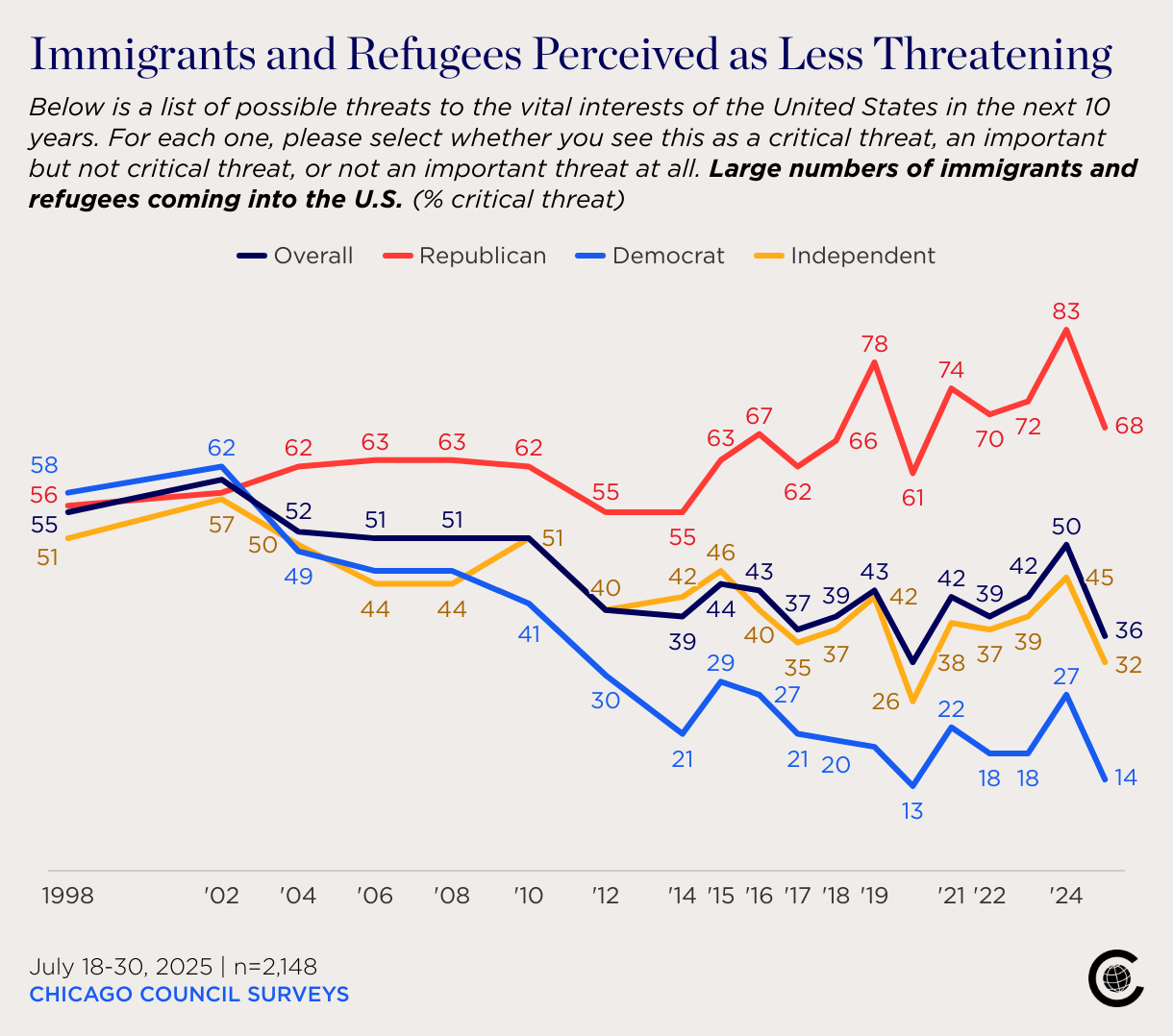 Below is a list of possible threats to the vital interests of the United States in the next 10 years. For each one, please select whether you see this as a critical threat, an important but not critical threat, or not an important threat at all. Large numbers of immigrants and refugees coming into the U.S. (% critical threat)