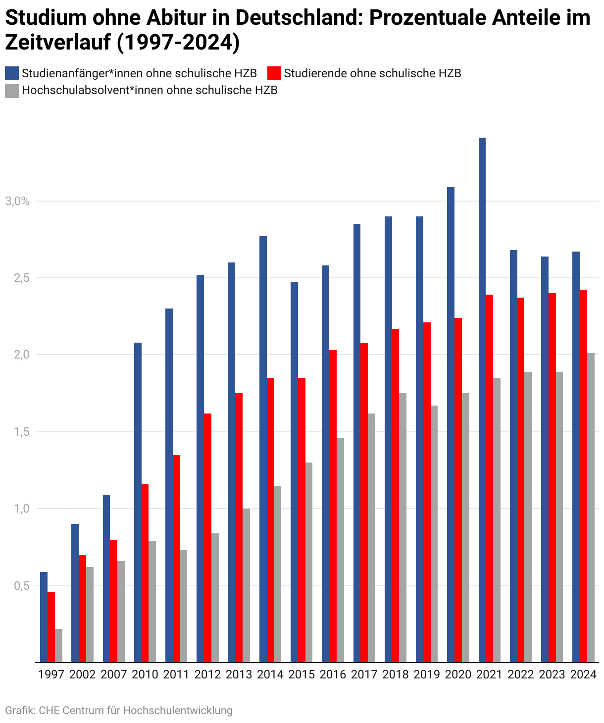 Studium ohne Abitur in Deutschland: Prozentuale Anteile im Zeitverlauf (1997-2024)