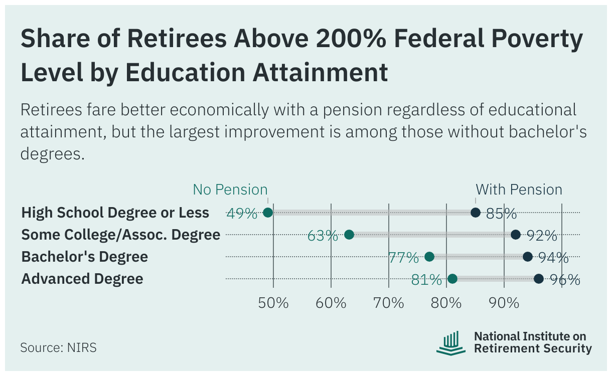 For those with a high school education or less, 49% of those without a pension are below the 200% of the federal poverty level. Among similarly educated retirees, but with a pension, only 15% are below that level.