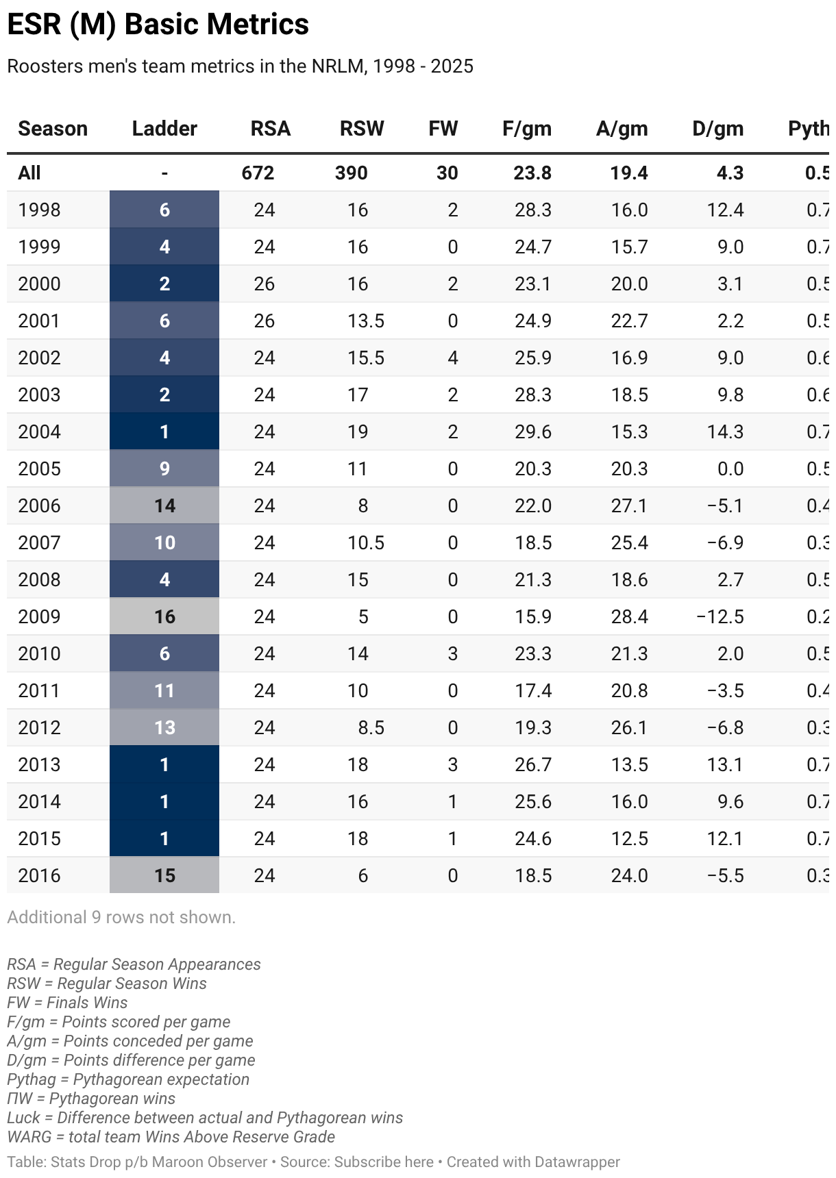 Roosters men's team metrics in the NRLM, 1998 - 2025