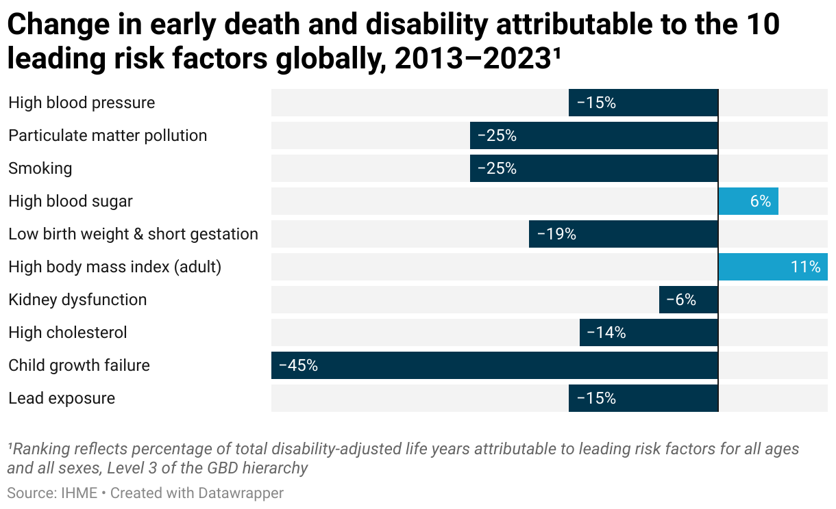 Health loss from high blood sugar and high body mass index is rising, but for many other risk factors it is dropping.