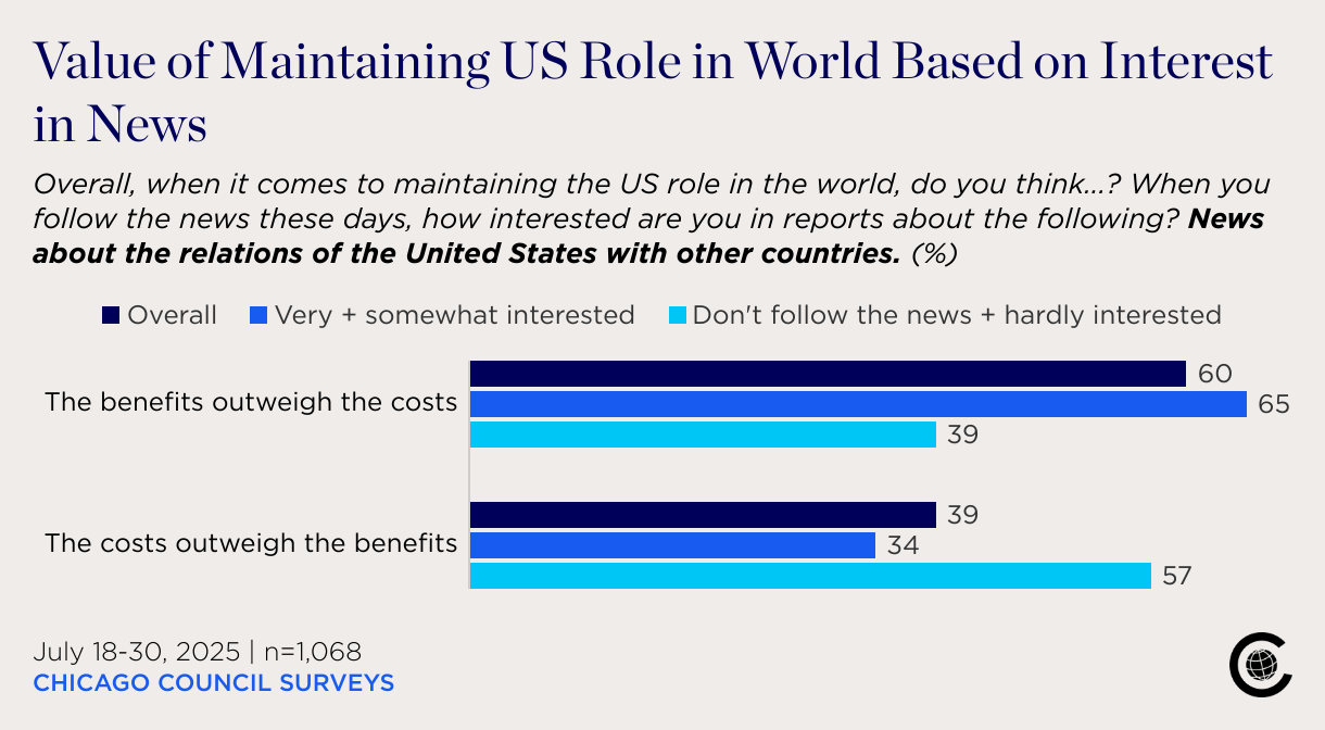 Overall, when it comes to maintaining the US role in the world, do you think...? When you follow the news these days, how interested are you in reports about the following? News about the relations of the United States with other countries. (%)