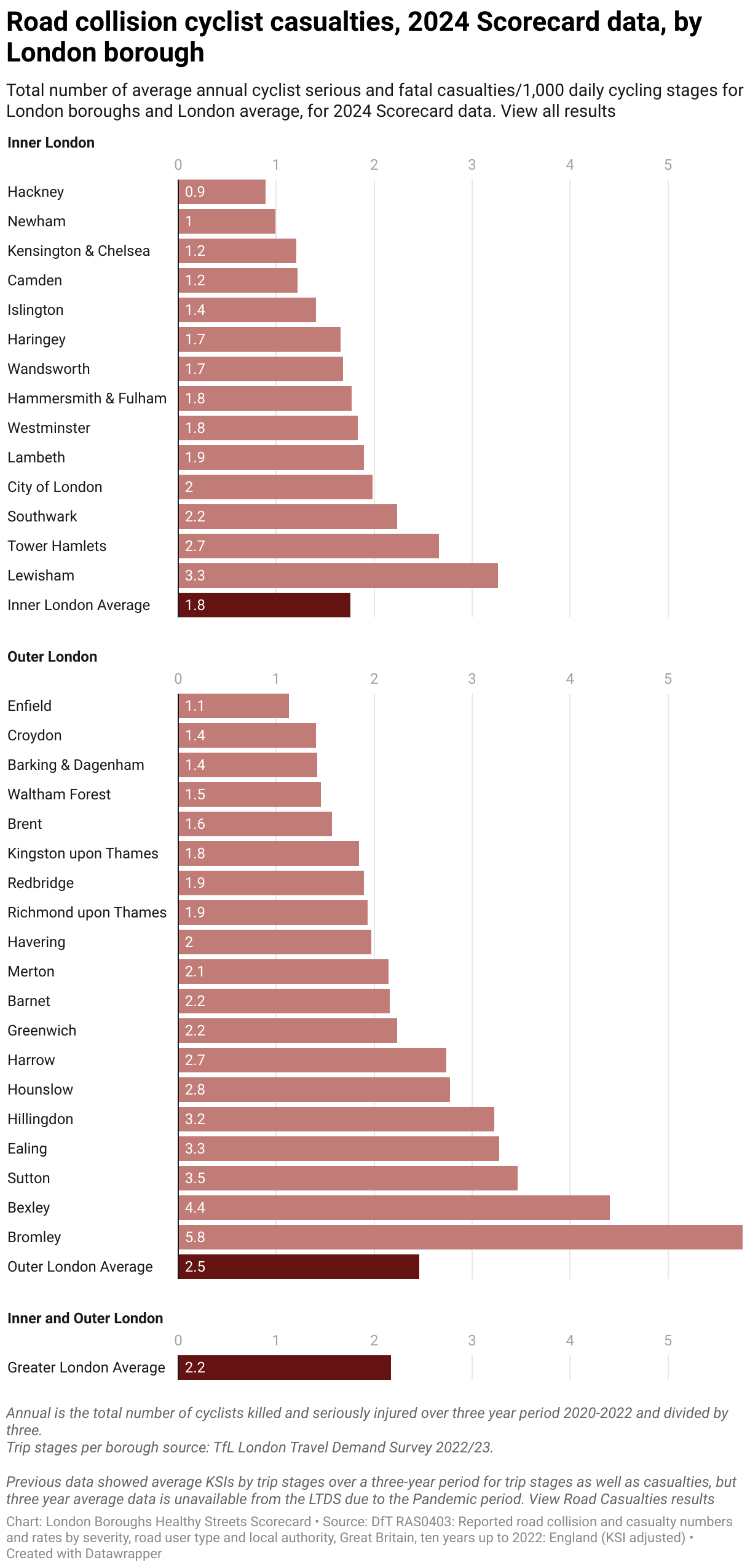 Total number of average annual cyclist serious and fatal casualties/1,000 daily cycling stages for London boroughs and London average, for 2024 Scorecard data. View all results