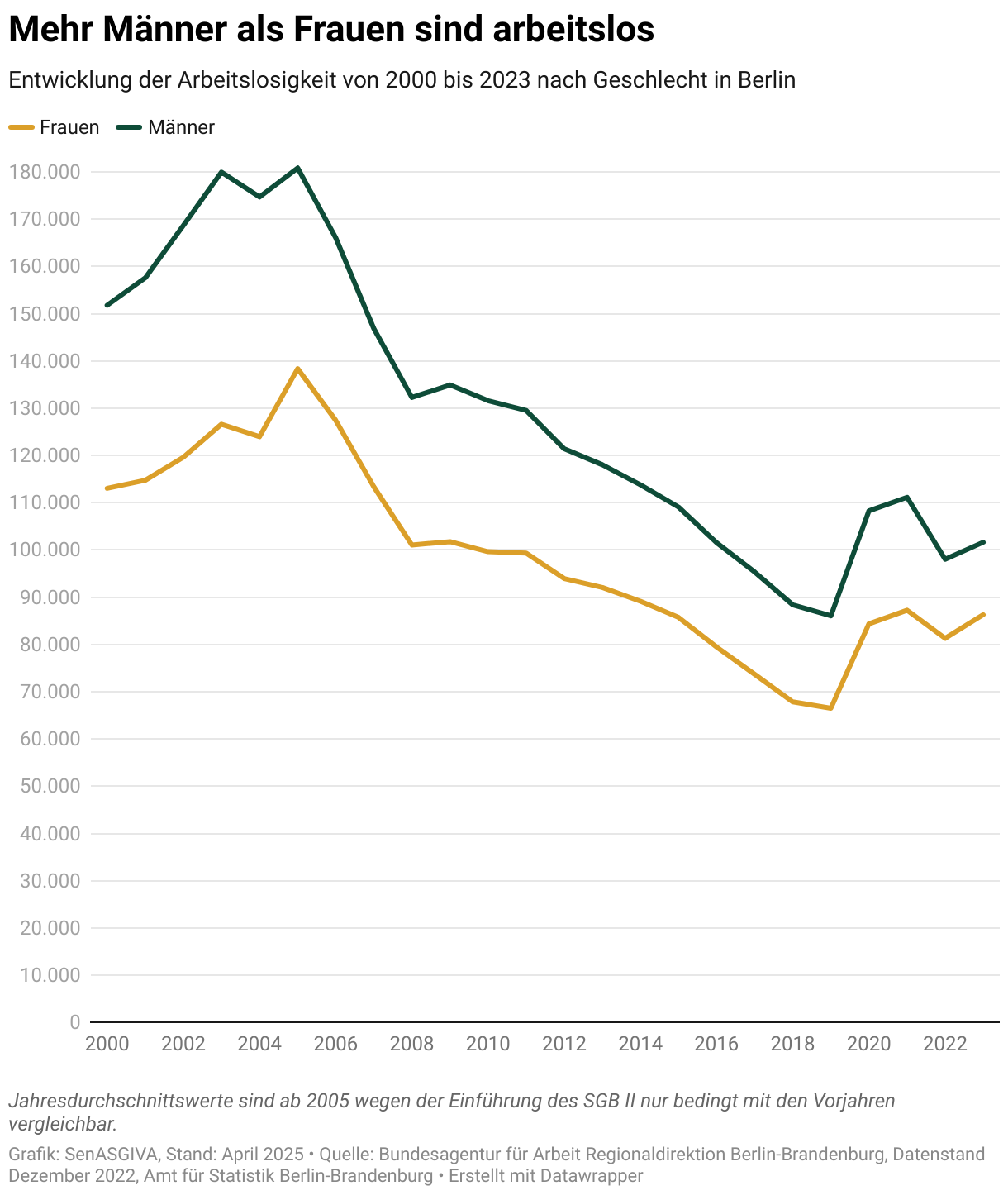 Von 2000 bis 2023 waren in jedem Jahr mehr Männer als Frauen arbeitslos.