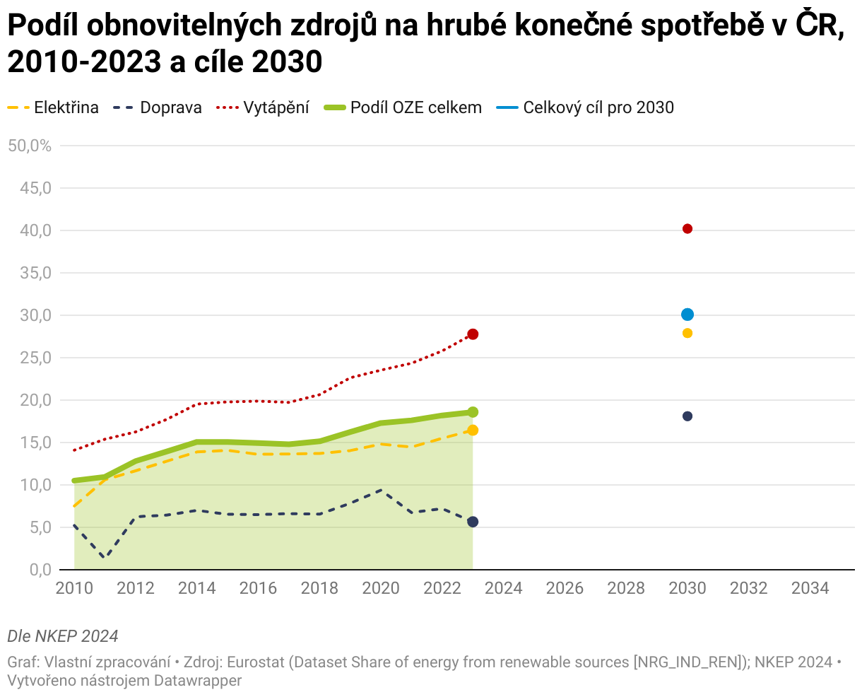 Podíl obnovitelných zdrojů na hrubé konečné spotřebě v ČR, 2010-2023 a cíle 2030