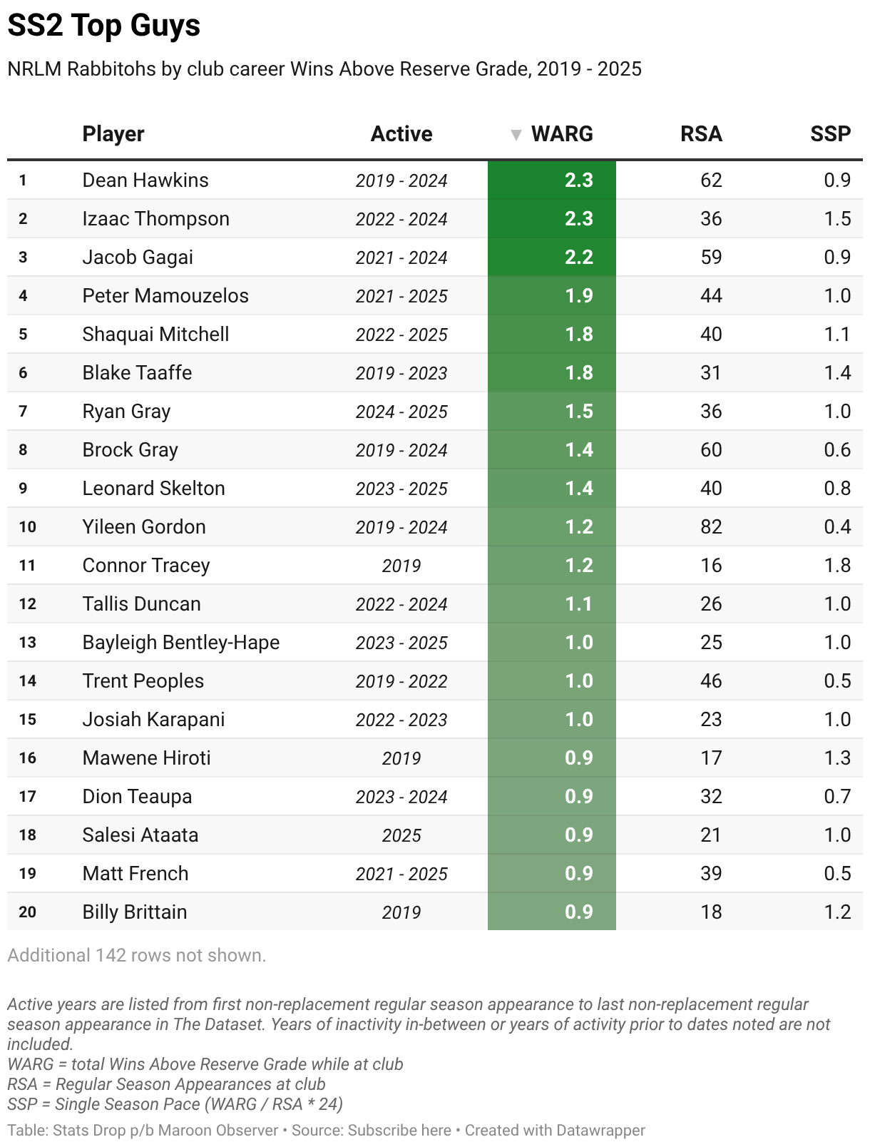 NRLM Rabbitohs by club career Wins Above Reserve Grade, 2019 - 2025