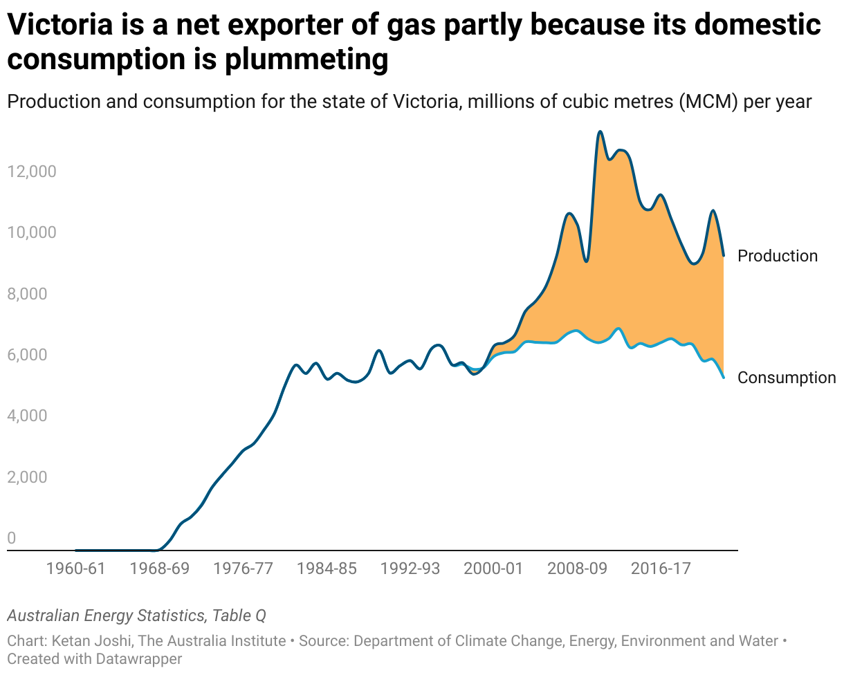 Production and consumption for the state of Victoria, millions of cubic metres (MCM) per year