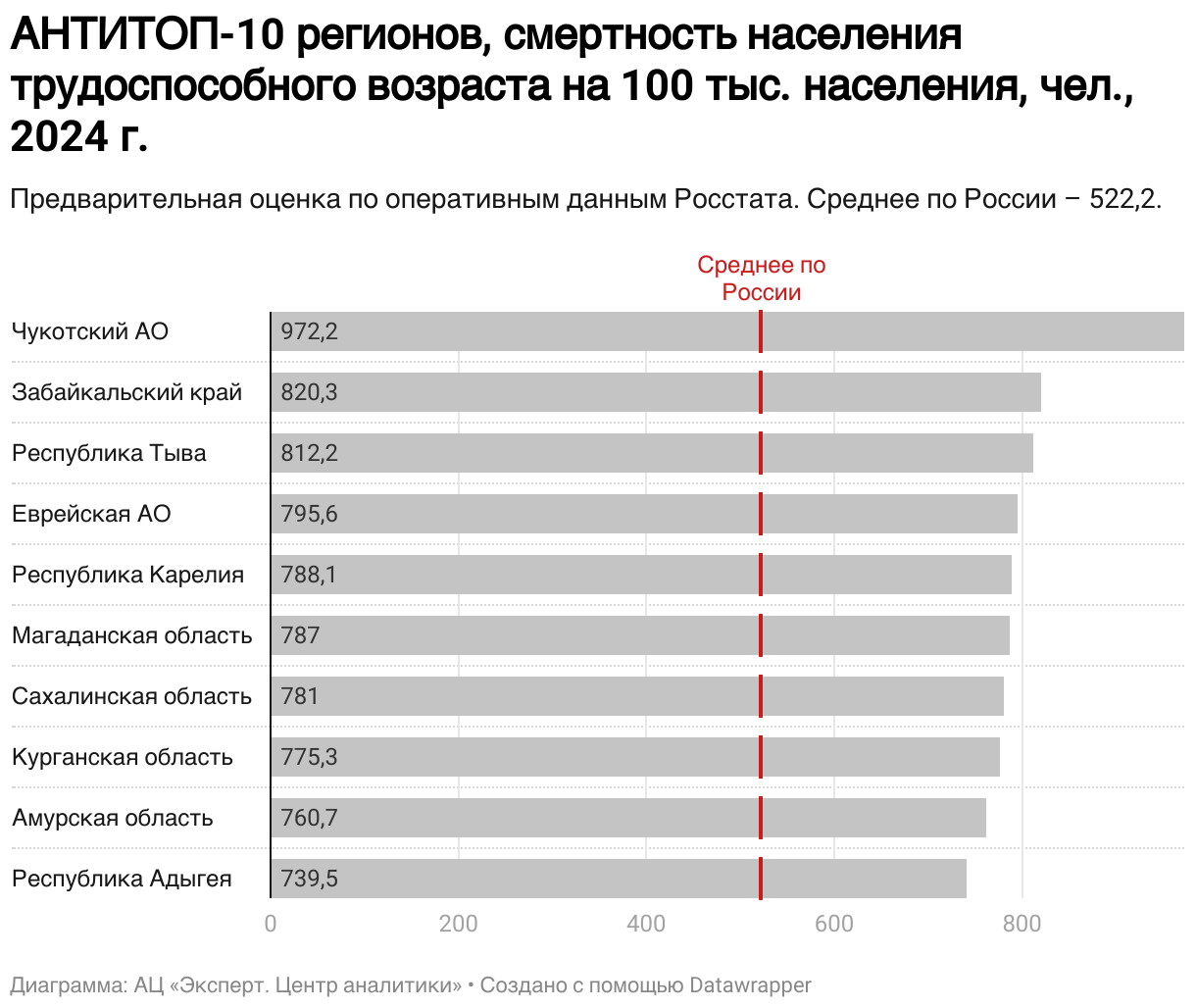 АНТИТОП-10 регионов, смертность населения трудоспособного возраста на 100 тыс. населения, чел., 2024 г.