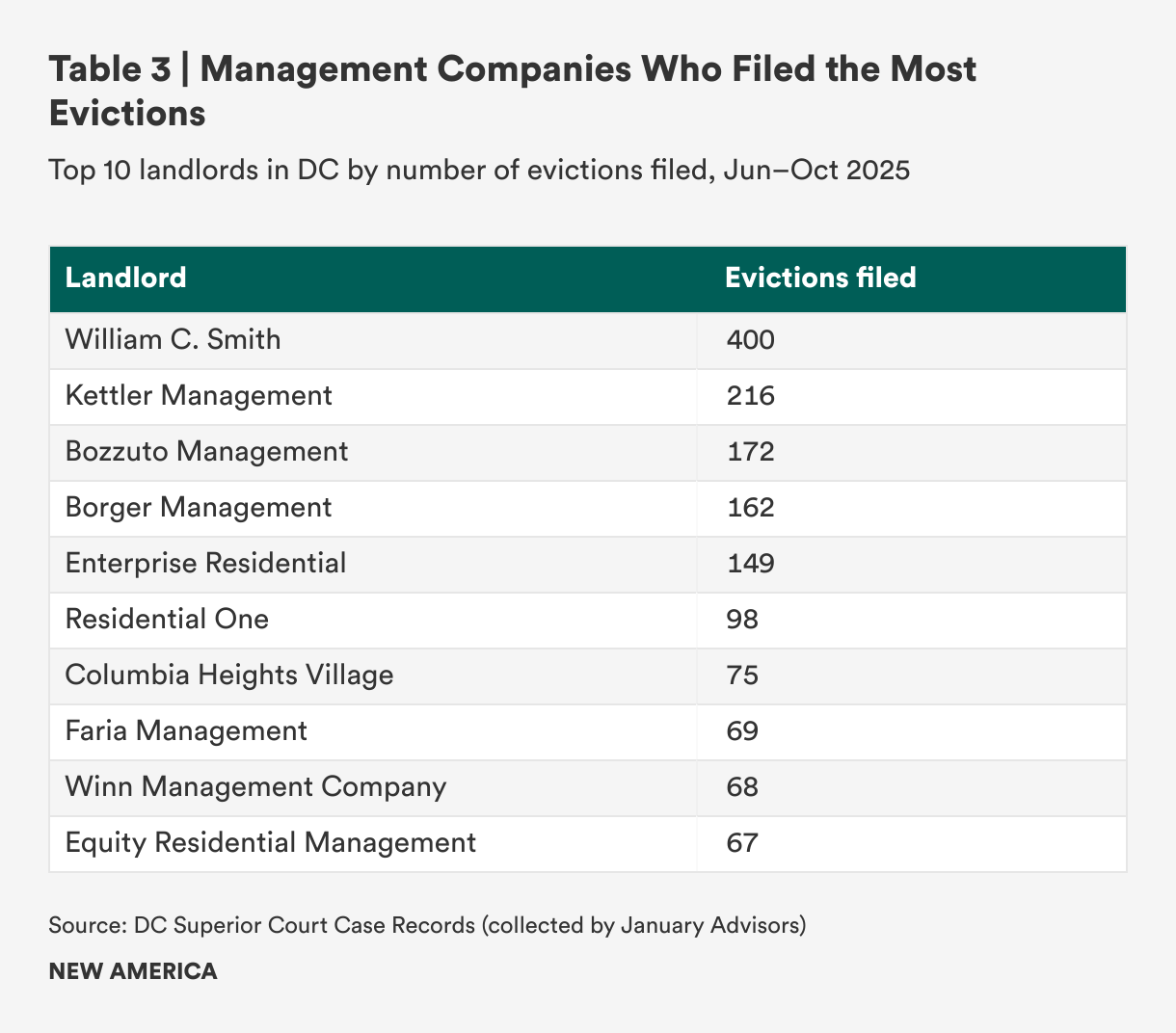 Top 10 landlords in DC by number of evictions filed, Jun–Oct 2025
