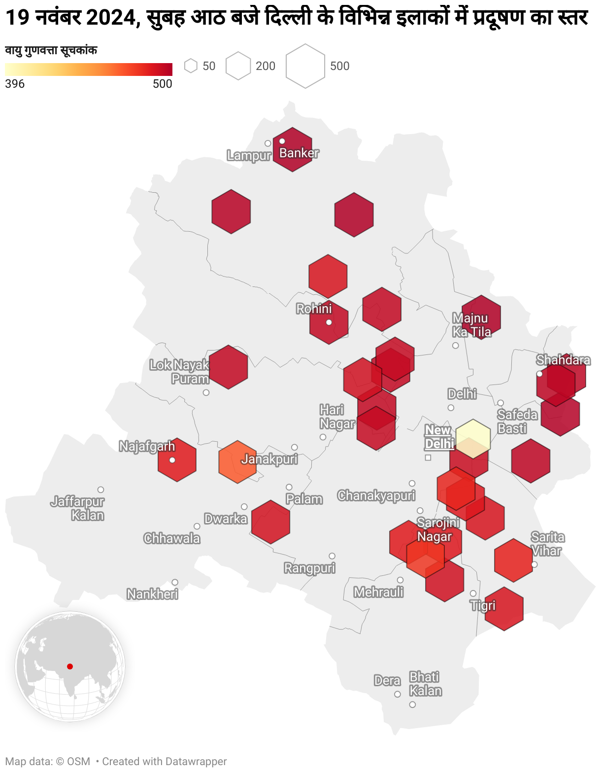 19 नवंबर 2024, सुबह आठ बजे दिल्ली के विभिन्न इलाकों में प्रदूषण का स्तर