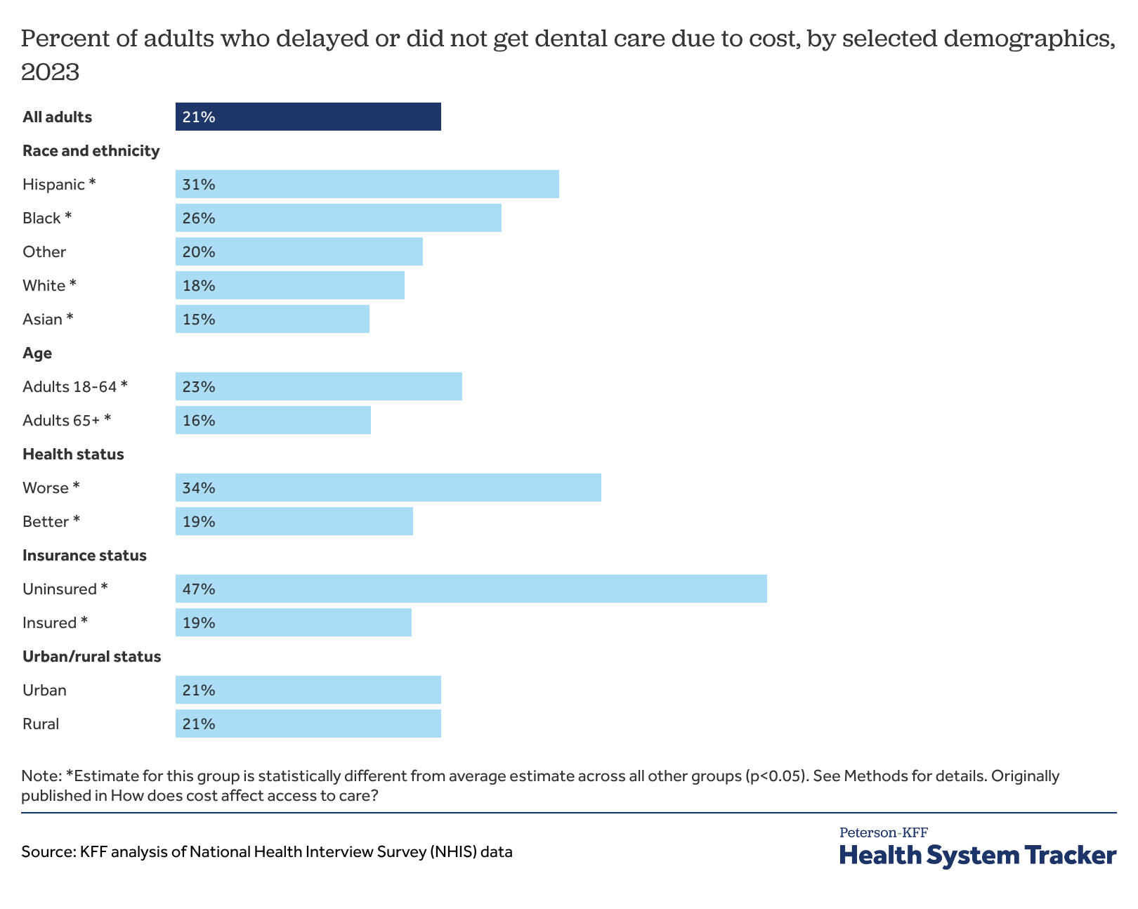 Percent of adults who delayed or did not get dental care due to cost, by selected demographics, 2023