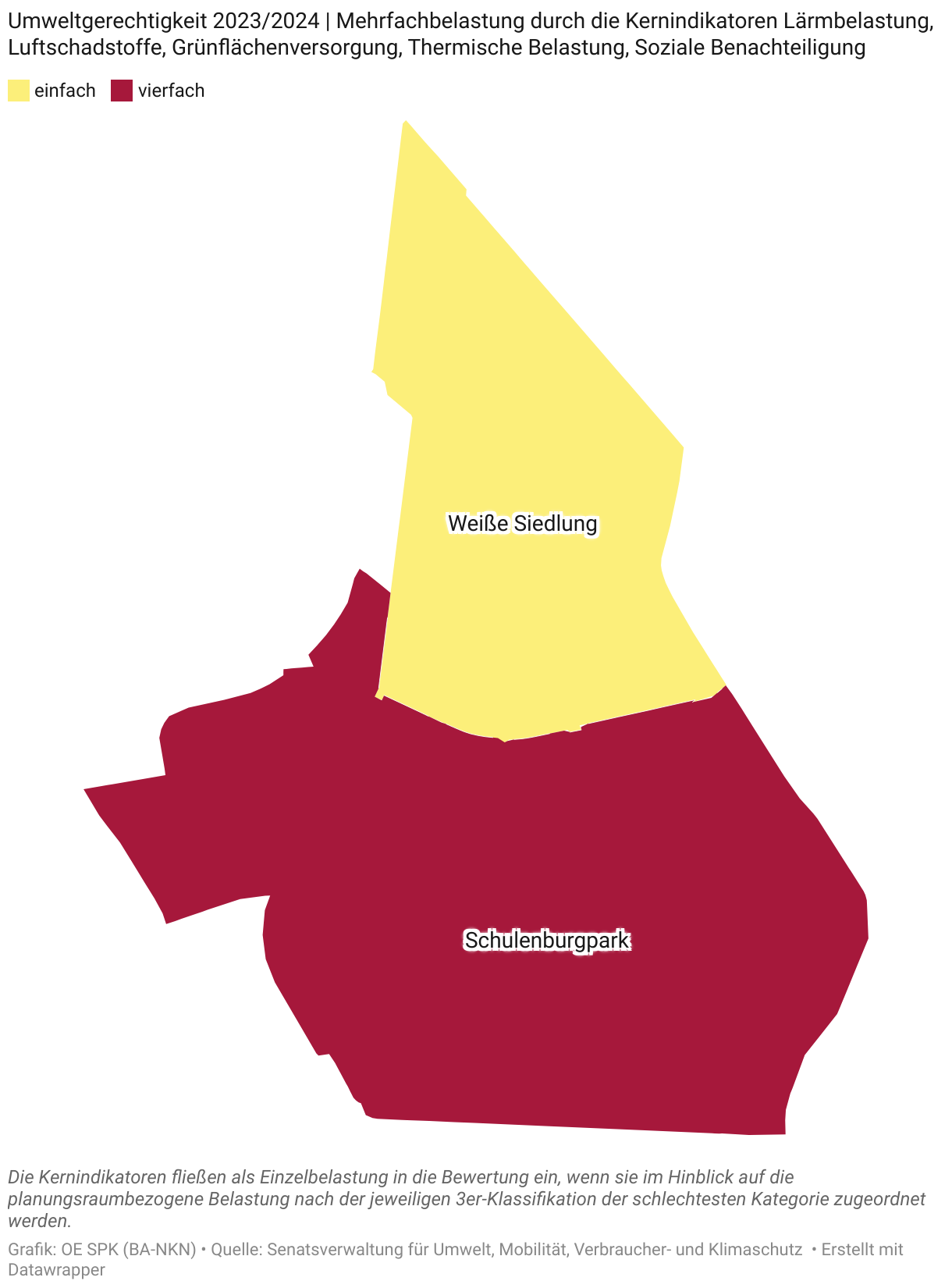 Umweltgerechtigkeit 2023/2024 | Mehrfachbelastung durch die Kernindikatoren Lärmbelastung, Luftschadstoffe, Grünflächenversorgung, Thermische Belastung, Soziale Benachteiligung