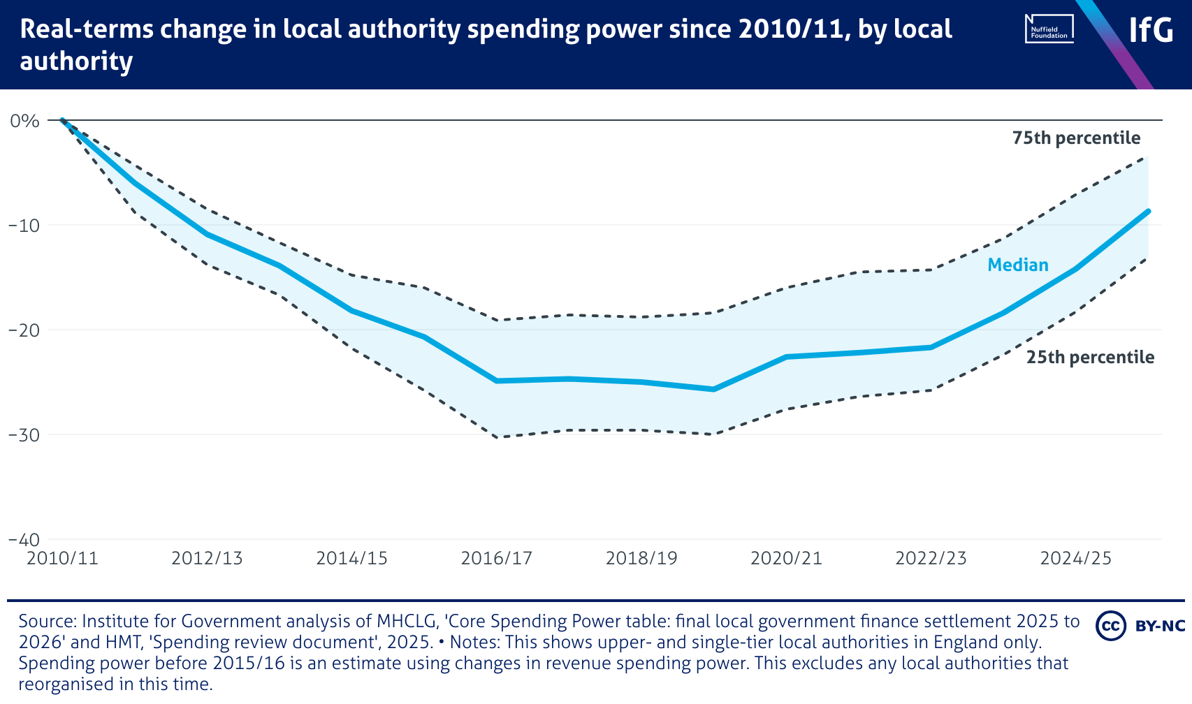 A line chart from the Institute for Government of real-terms change in local authority spending power since 2010/11, by local authority, where the median fell by just over 25% up to 2019/20 before partly recovering, with the gap between the 25th and 75th percentile widening since 2010/11.