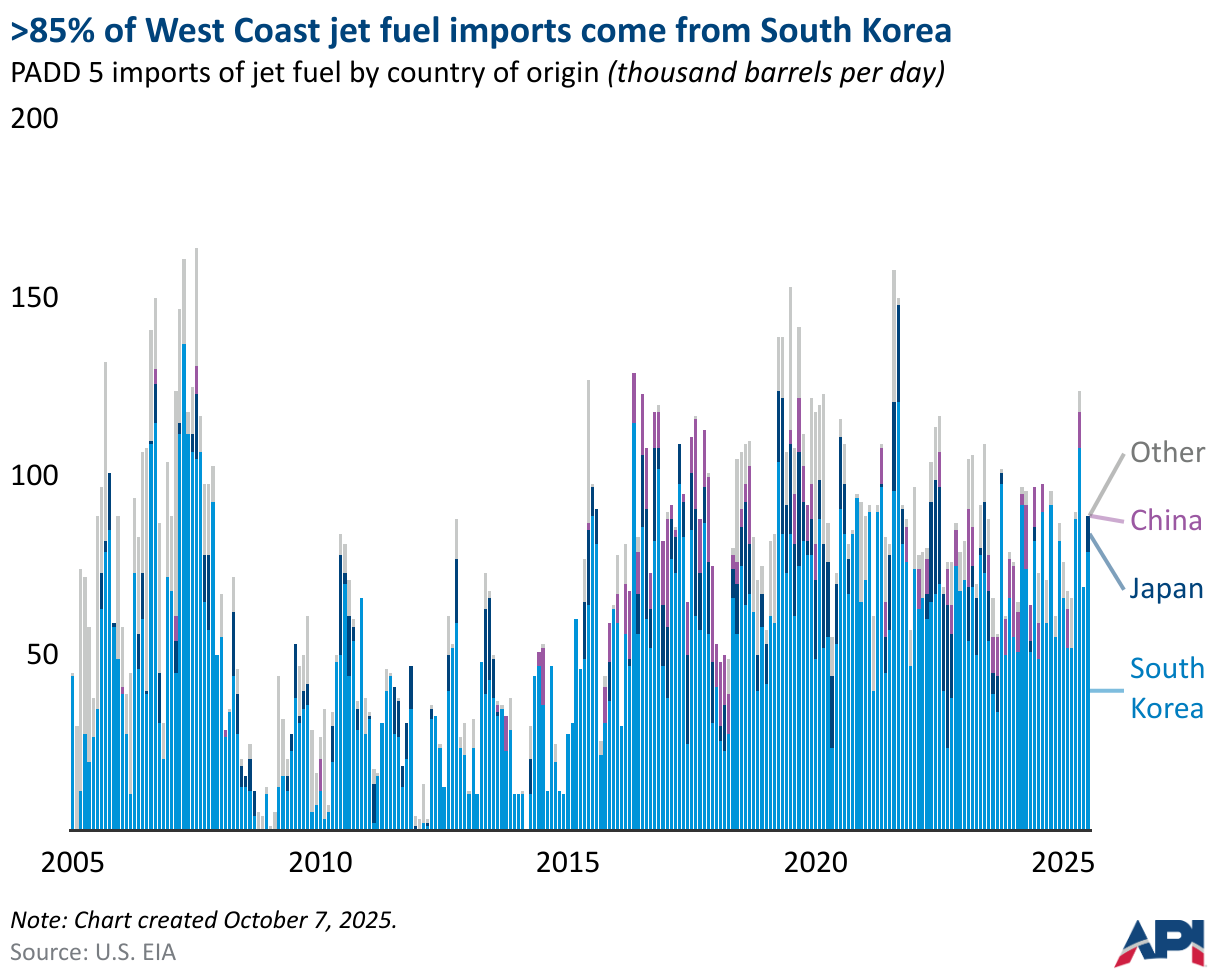 PADD 5 imports of jet fuel by country of origin (thousand barrels per day)