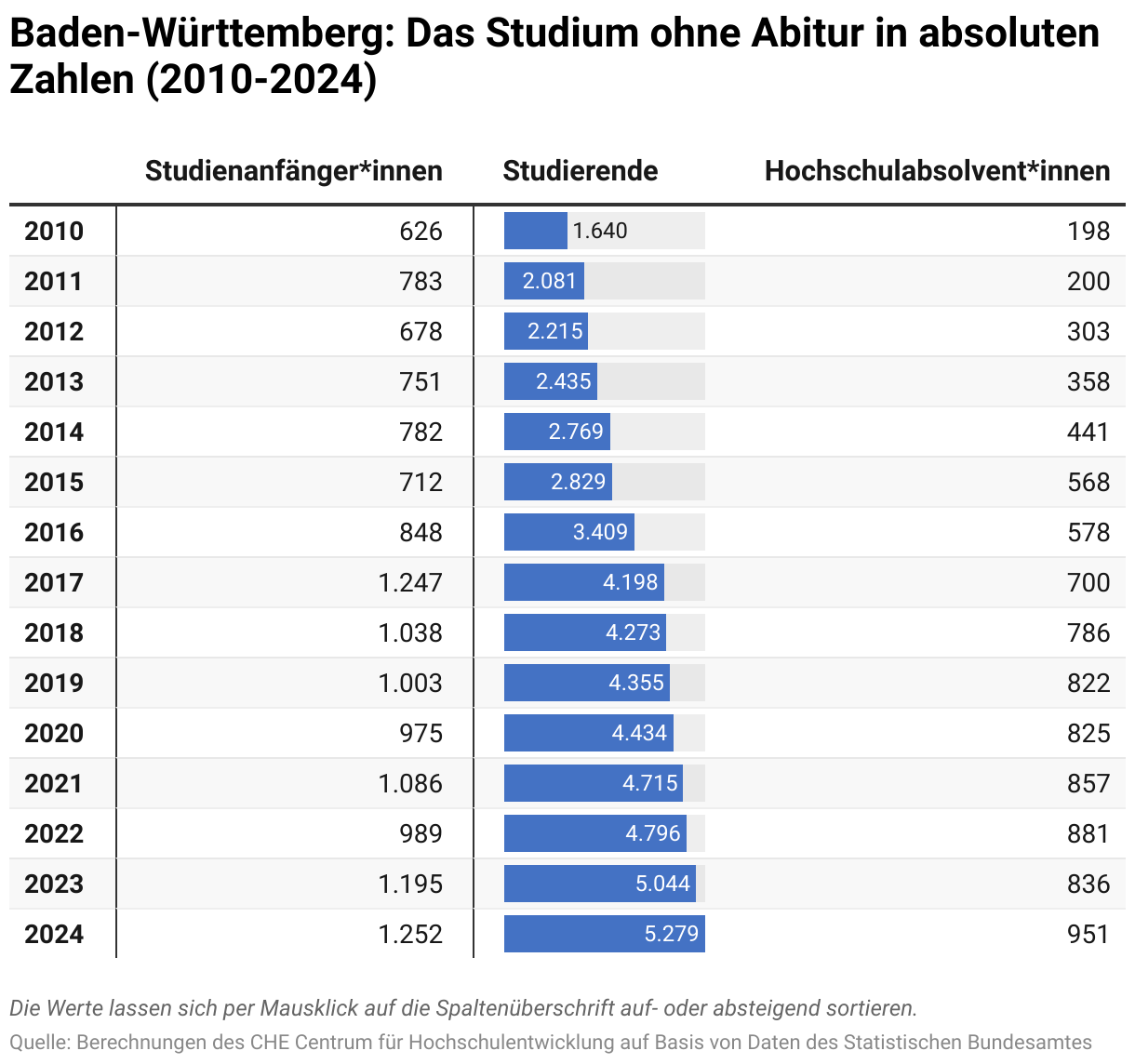Baden-Württemberg: Das Studium ohne Abitur in absoluten Zahlen (2010-2024)