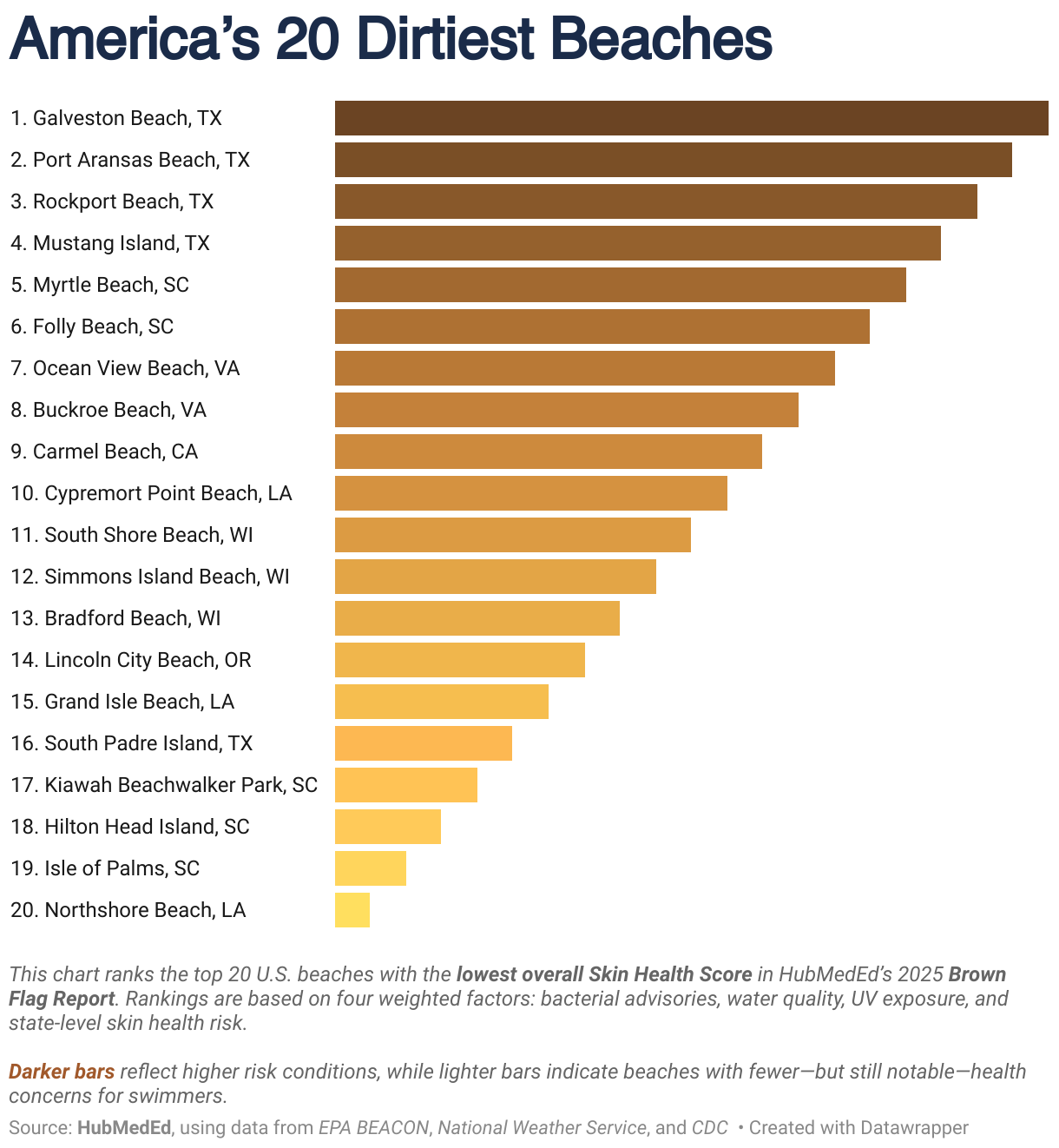 This bar chart ranks the 20 U.S. beaches with the lowest overall Skin Health Score in HubMedEd’s 2025 Brown Flag Report. Galveston Beach in Texas ranks as the dirtiest, followed by Port Aransas and Rockport Beach. The ranking is based on bacterial advisories, water quality, UV exposure, and state-level skin health risk. Darker bars indicate higher risk.