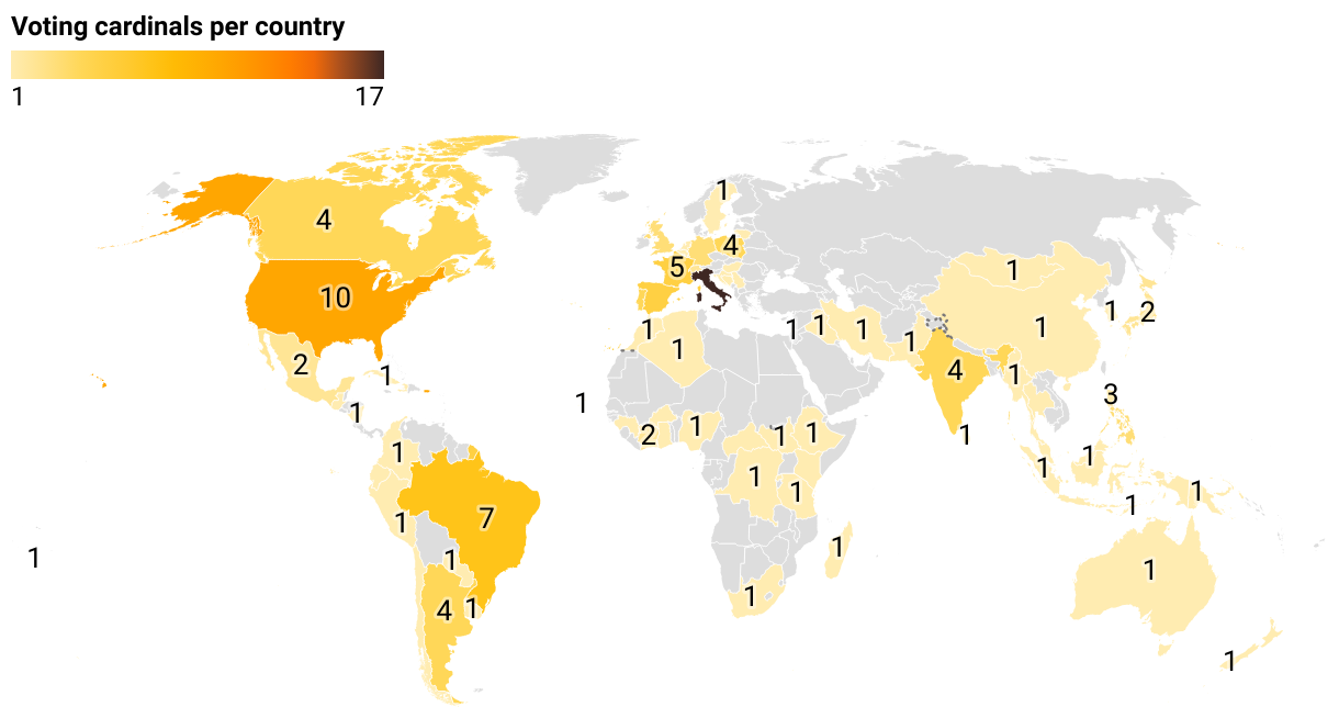 The College of Cardinals, which comprises all the cardinals of the Roman Catholic Church, currently has 252 members. Of these, 135 are under the age of 80 and thus eligible to vote in the upcoming conclave to elect the next pope.