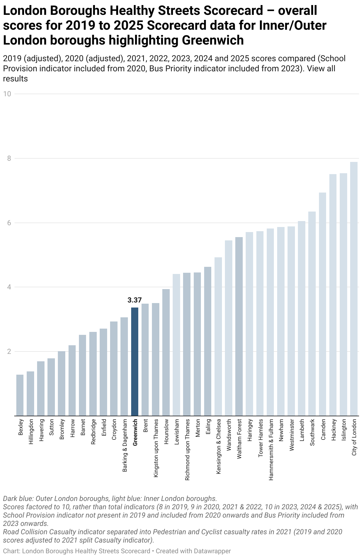 London Boroughs Healthy Streets Scorecard – overall scores for 2019 to 2025 Scorecard data for Inner/Outer London boroughs highlighting Greenwich