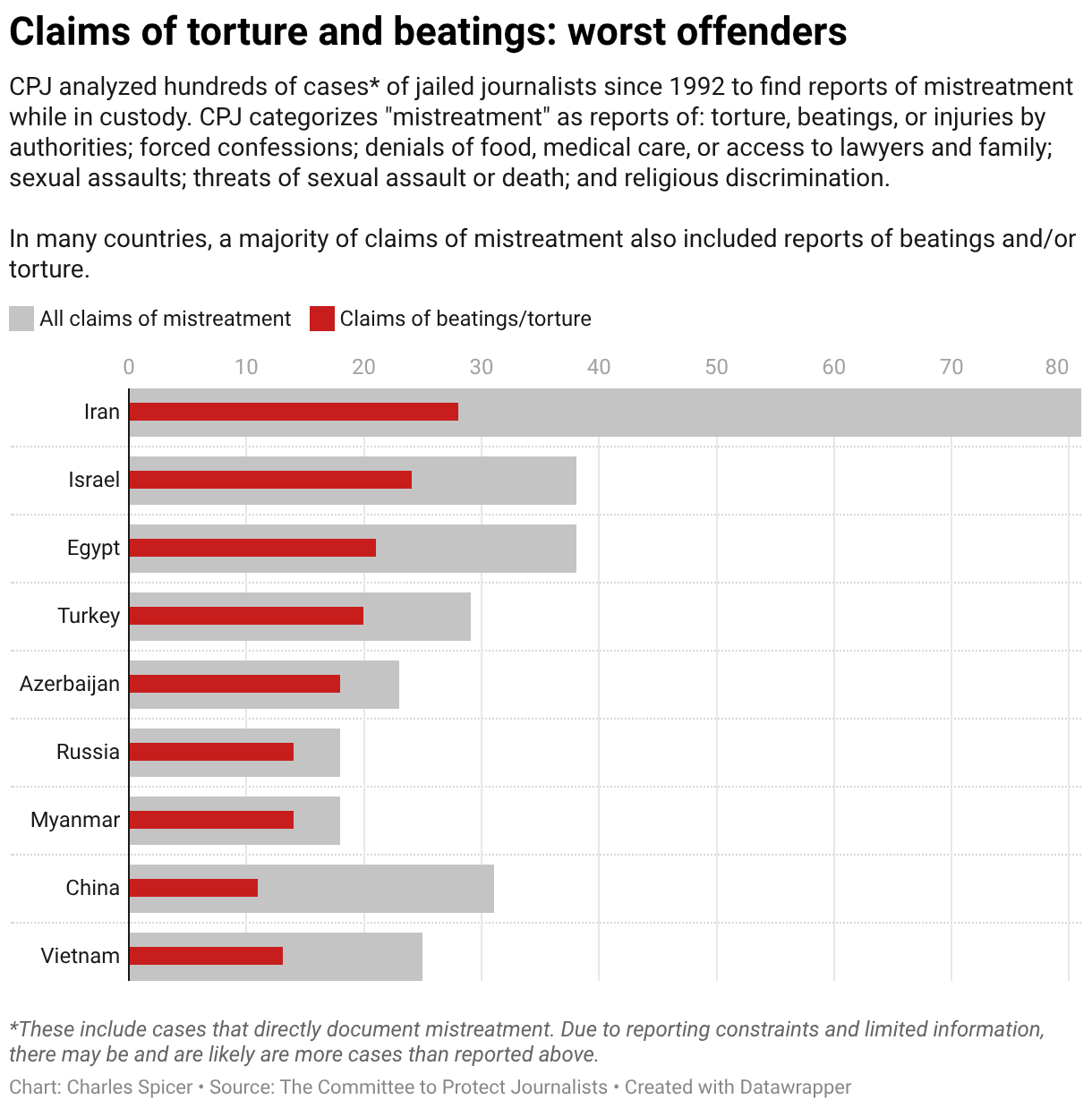 CPJ analyzed hundreds of cases* of jailed journalists since 1992 to find reports of mistreatment while in custody. CPJ categorizes "mistreatment" as reports of: torture, beatings, or injuries by authorities; forced confessions; denials of food, medical care, or access to lawyers and family; sexual assaults; threats of sexual assault or death; and religious discrimination.