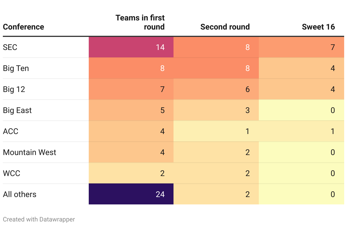 The 2025 NCAA men's basketball tournament saw a record 14 teams from the SEC selected. Here's how the conferences with multiple teams selected have fared so far: