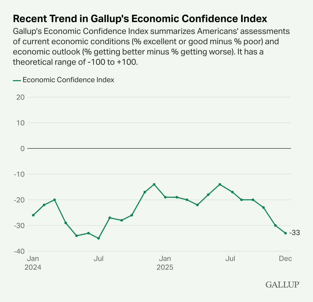 Line graph showing U.S. Economic Confidence Index from January 2024 to December 2025, declining from -26 to -33. The index peaked at -14 in January 2025 before trending downward.