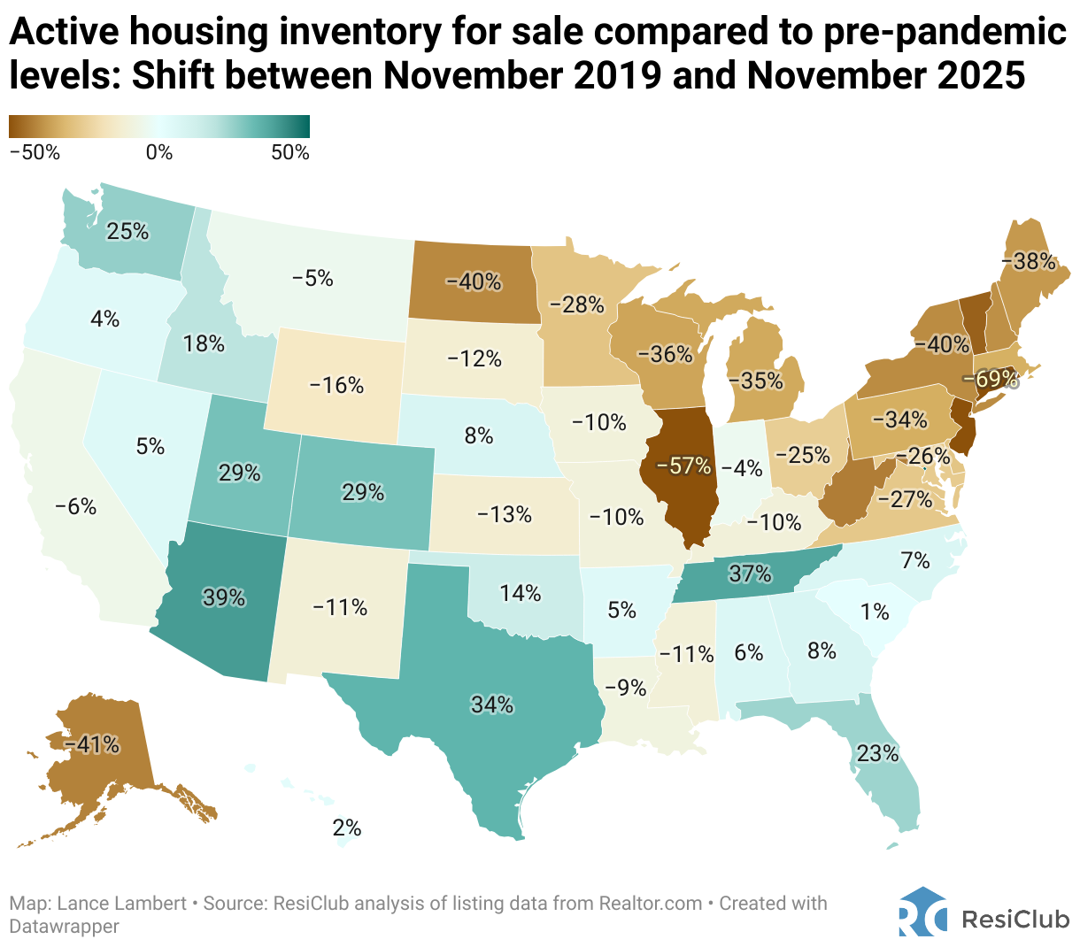 Active housing inventory for sale compared to pre-pandemic levels: Shift between November 2019 and November 2025