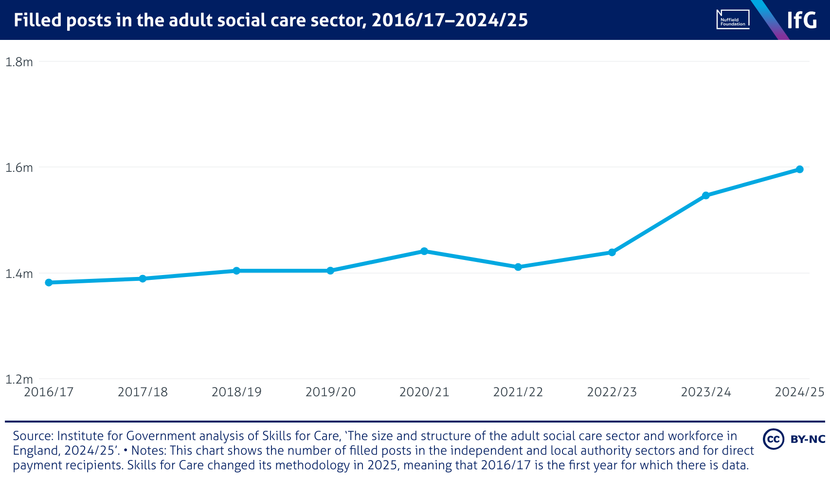 A line chart from the Institute for Government of the size of the adult social care workforce between 2012/13 and 20222/23 where the number of staff employed rises from 1.5m in 2012/12 to 1.68m in 2020/21, before falling for the first time to 1.62m in 2021/22 and rising slightly to 1.64m in 2022/23.
