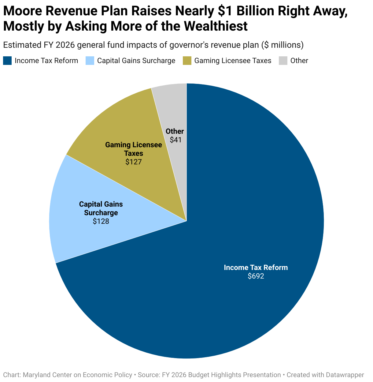 Pie chart showing estimated fiscal year 2026 general fund impacts of the governor's revenue plan, where the Moore revenue plan raises nearly $1 billion right away, mostly by asking more of the wealthiest.